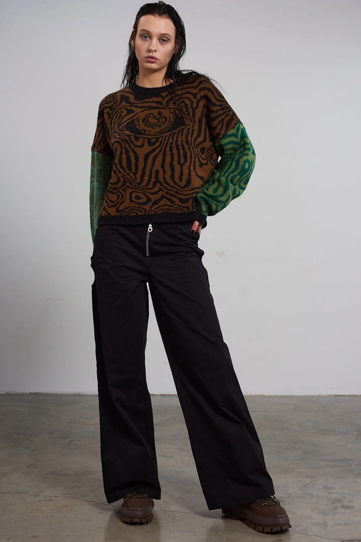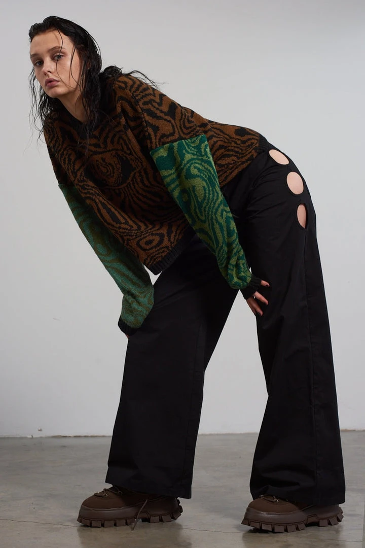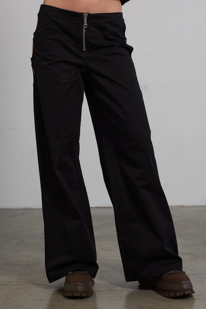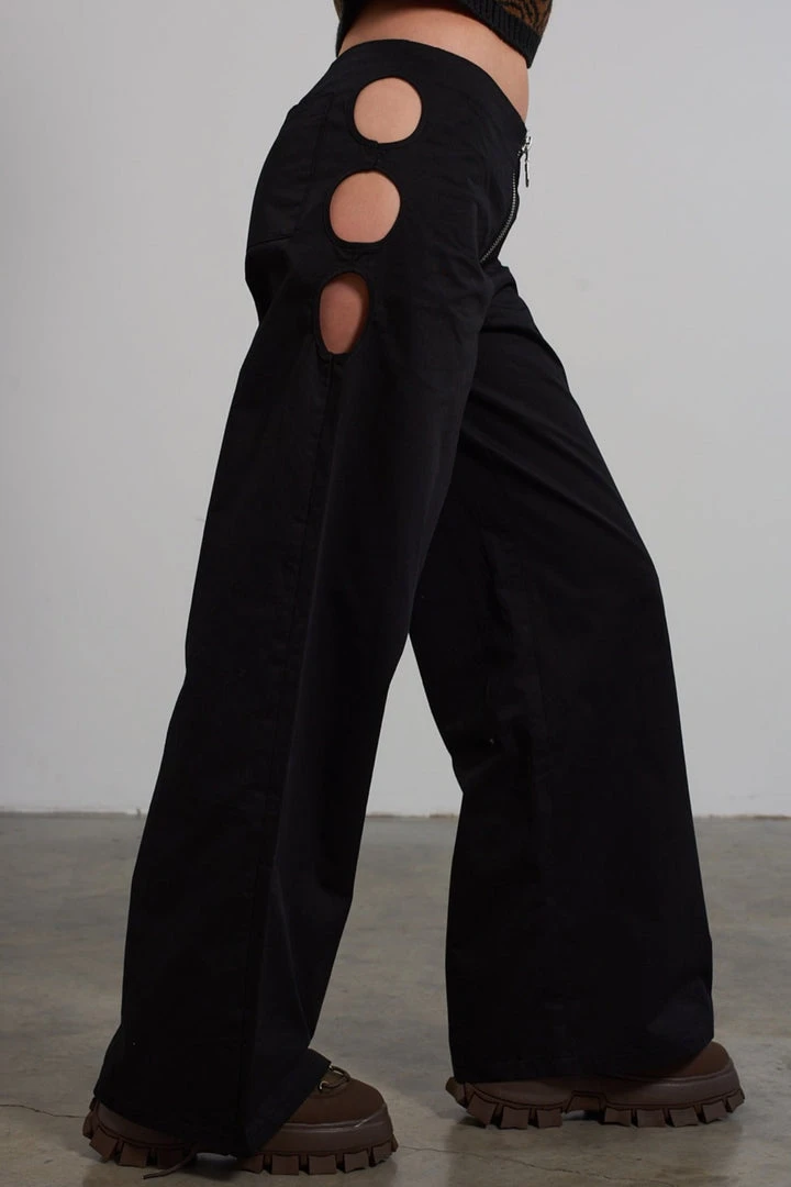 The Ragged Priest black wide leg pant with cut out hole sides and zip fastening.
