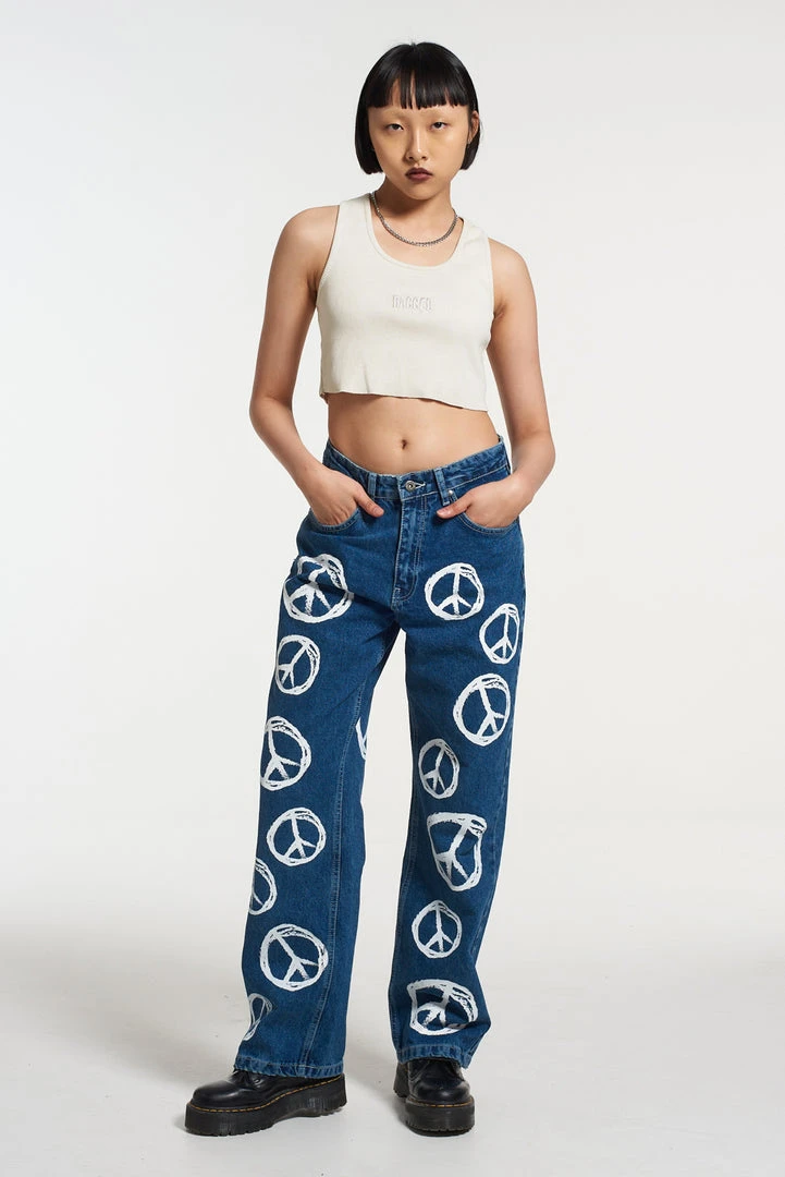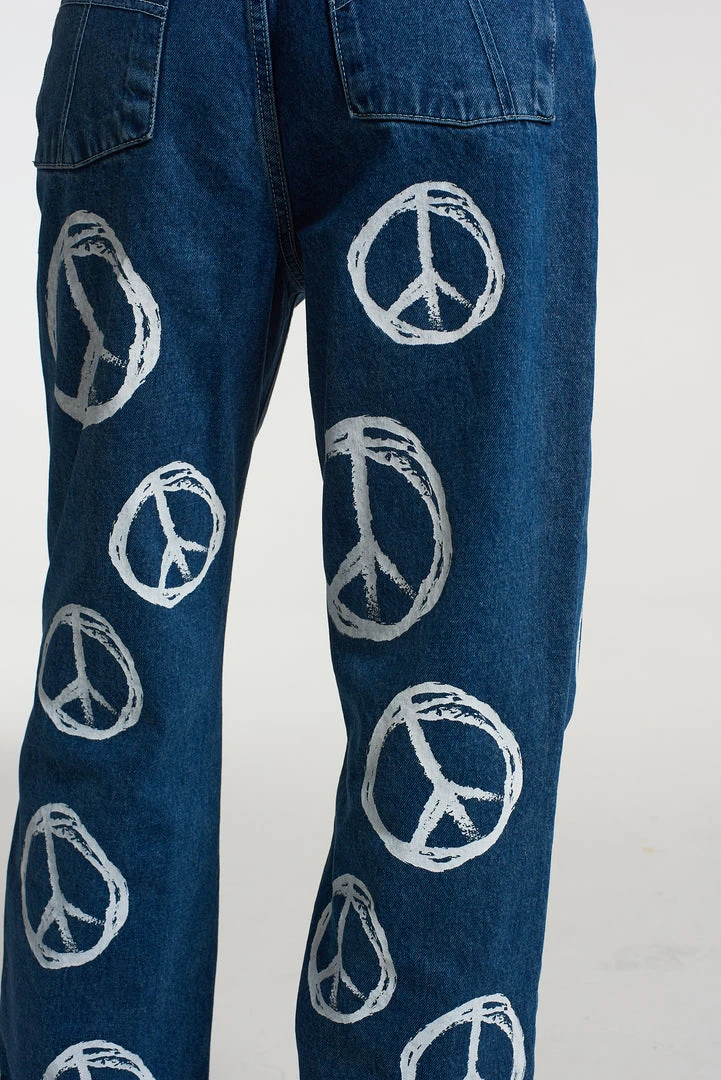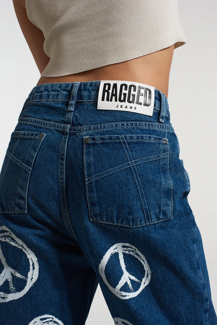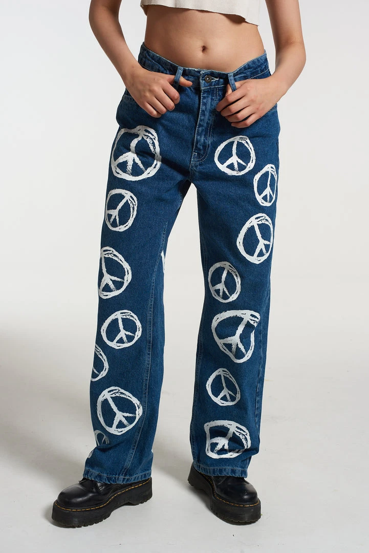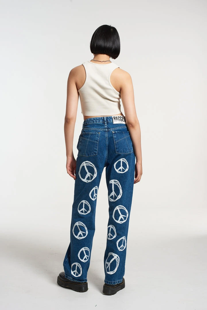 The Ragged Priest white peace sign printed jeans in scribble hand drawn style on our classic mid blue dad jeans