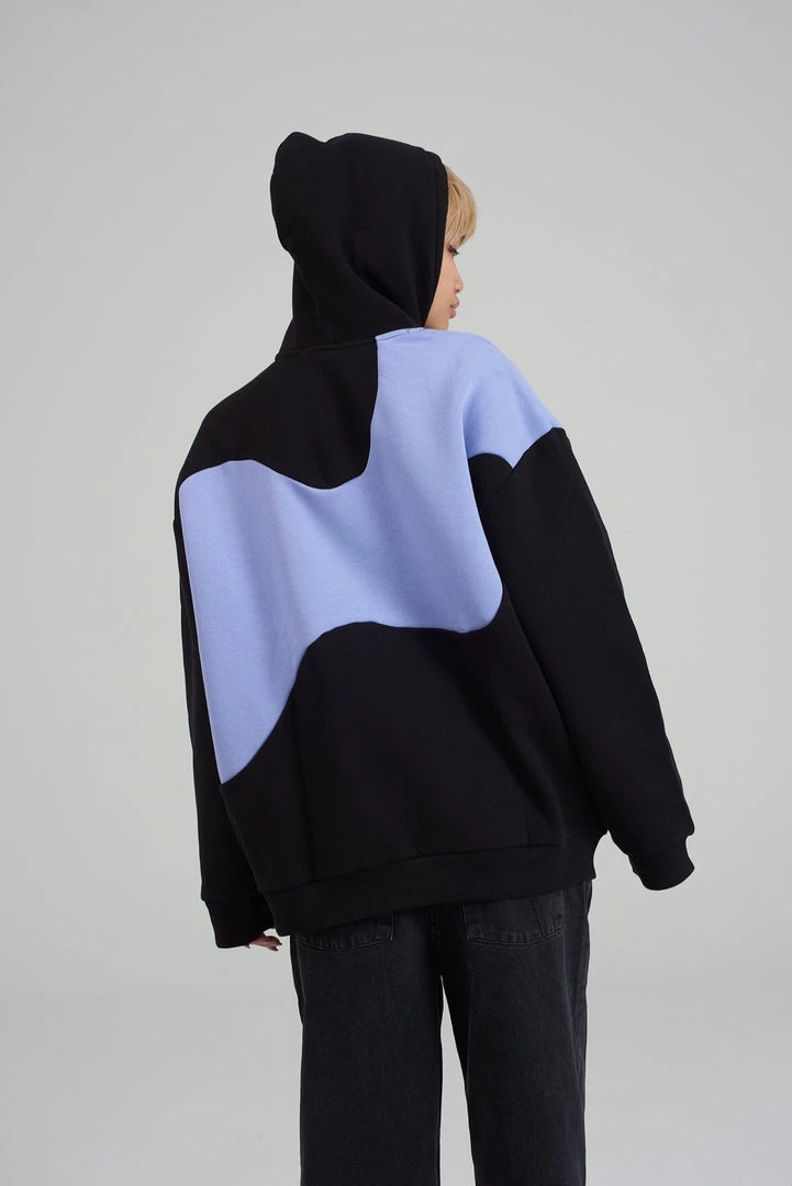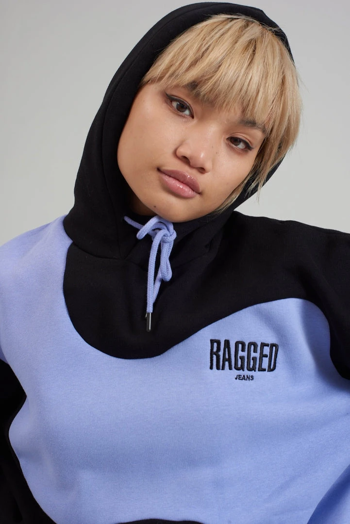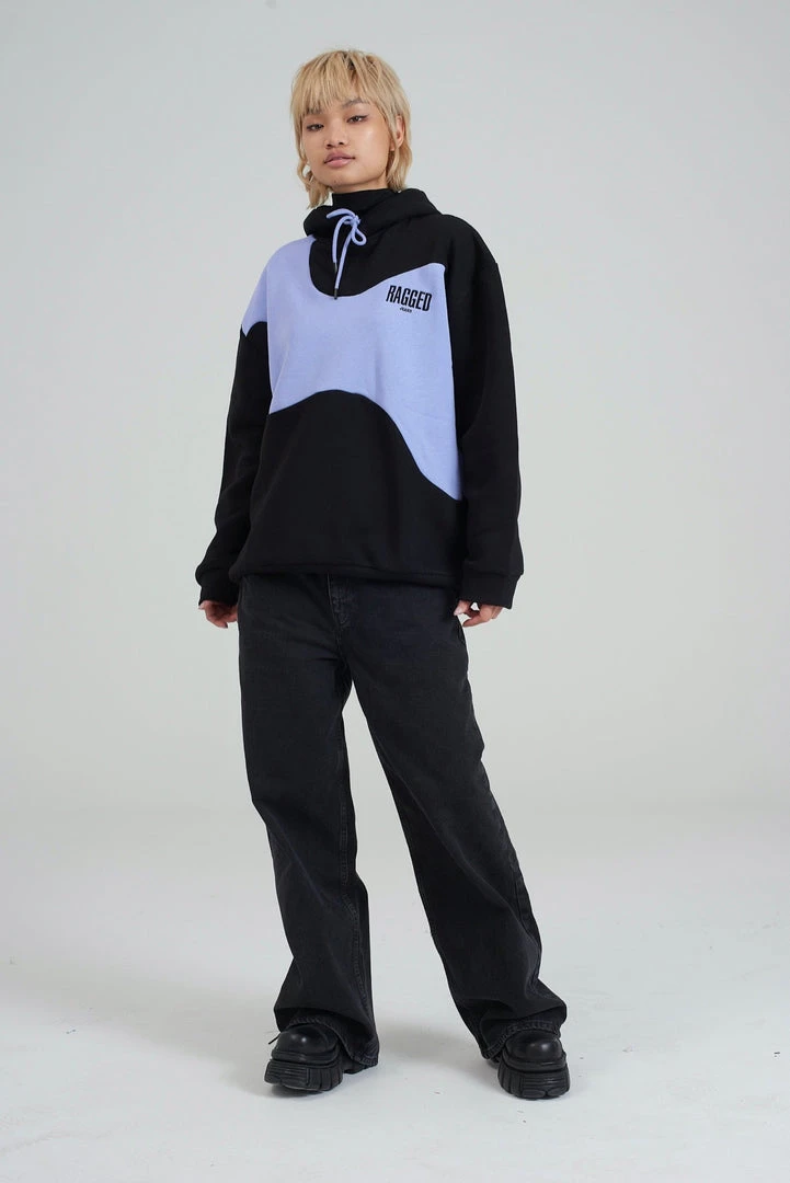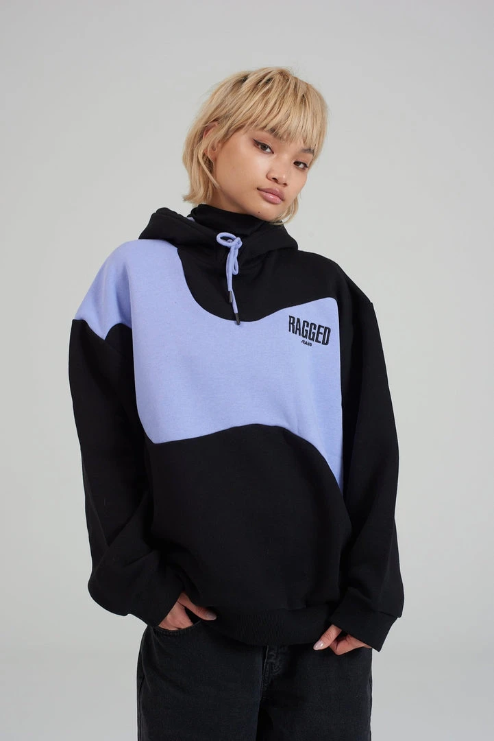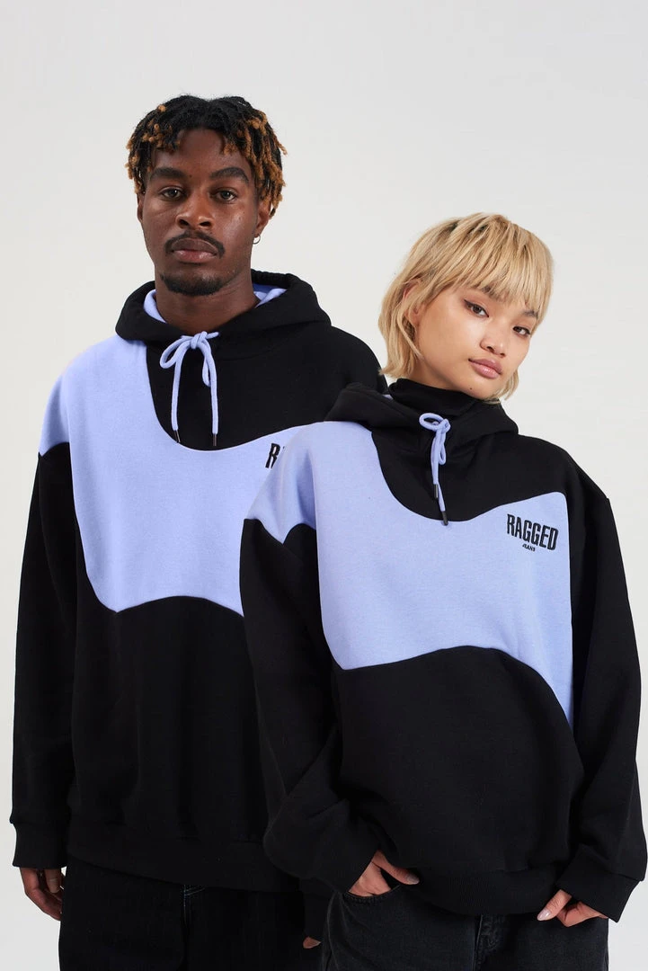 Ragged Jeans unisex black hoodie with purple wiggle print.
