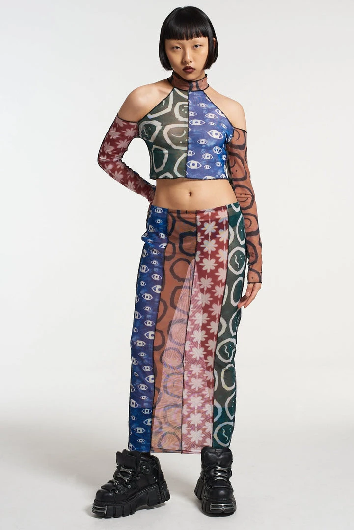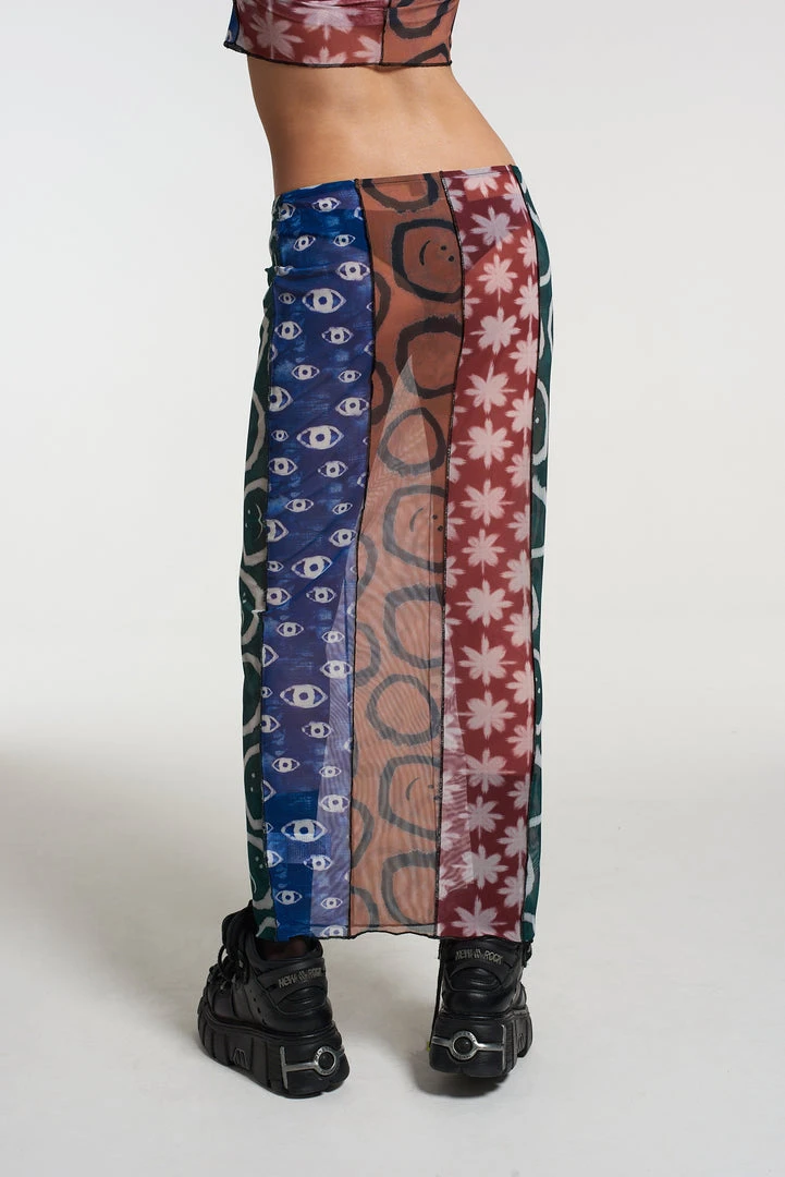 The Ragged Priest Multi panel patchwork graphic printed mesh maxi skirt.Â