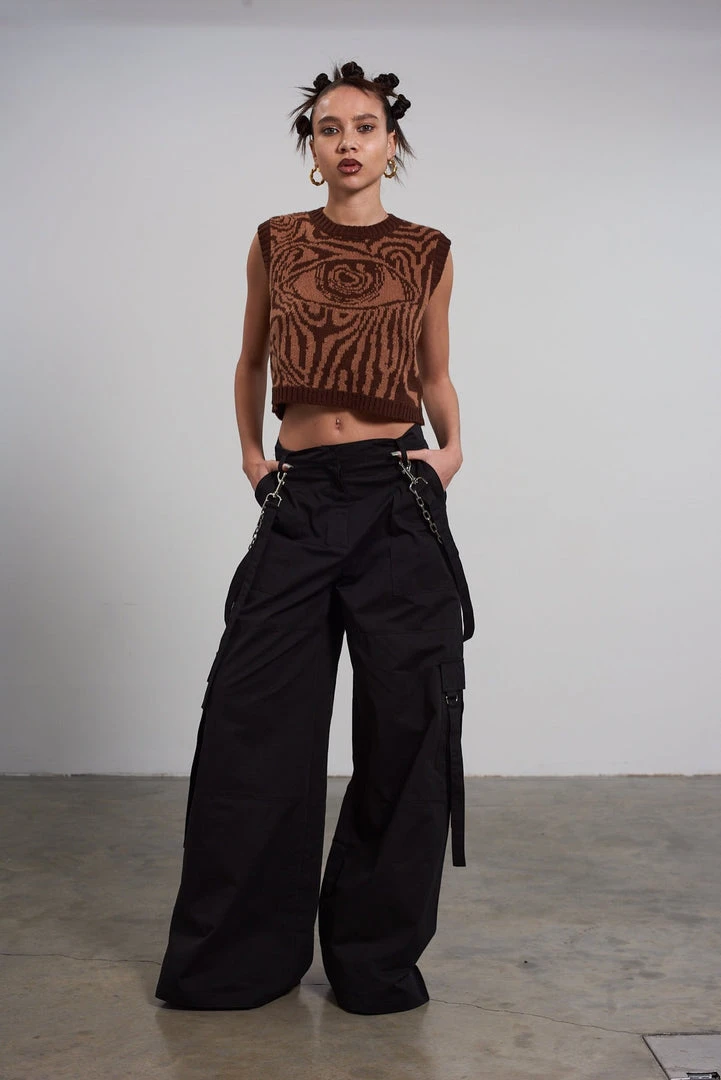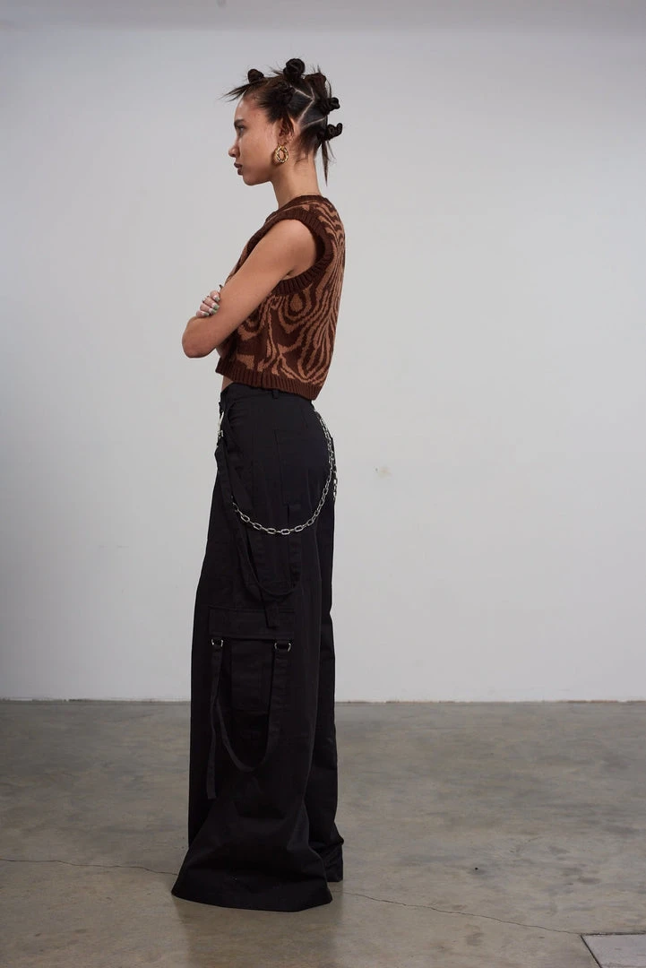 The Ragged Priest black super wide leg combat pant with straps and chains detail.