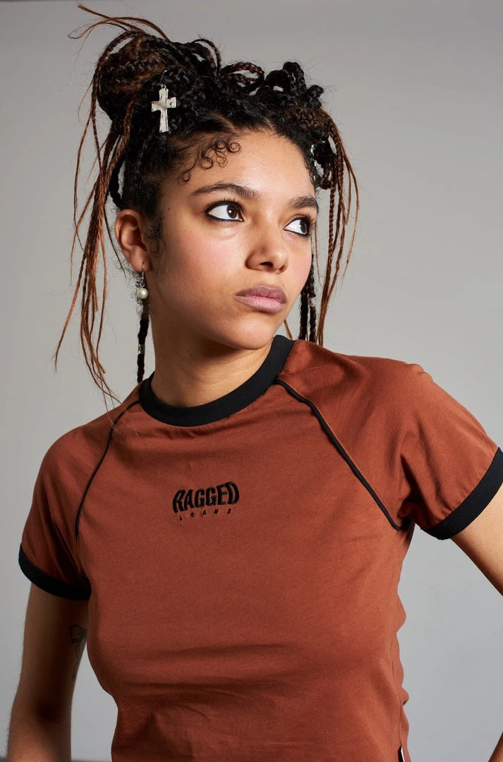 Ragged Jeans brown short sleeve top with raglan sleeves, black trim, and black ‘Ragged Jeans’ embroidered logo.