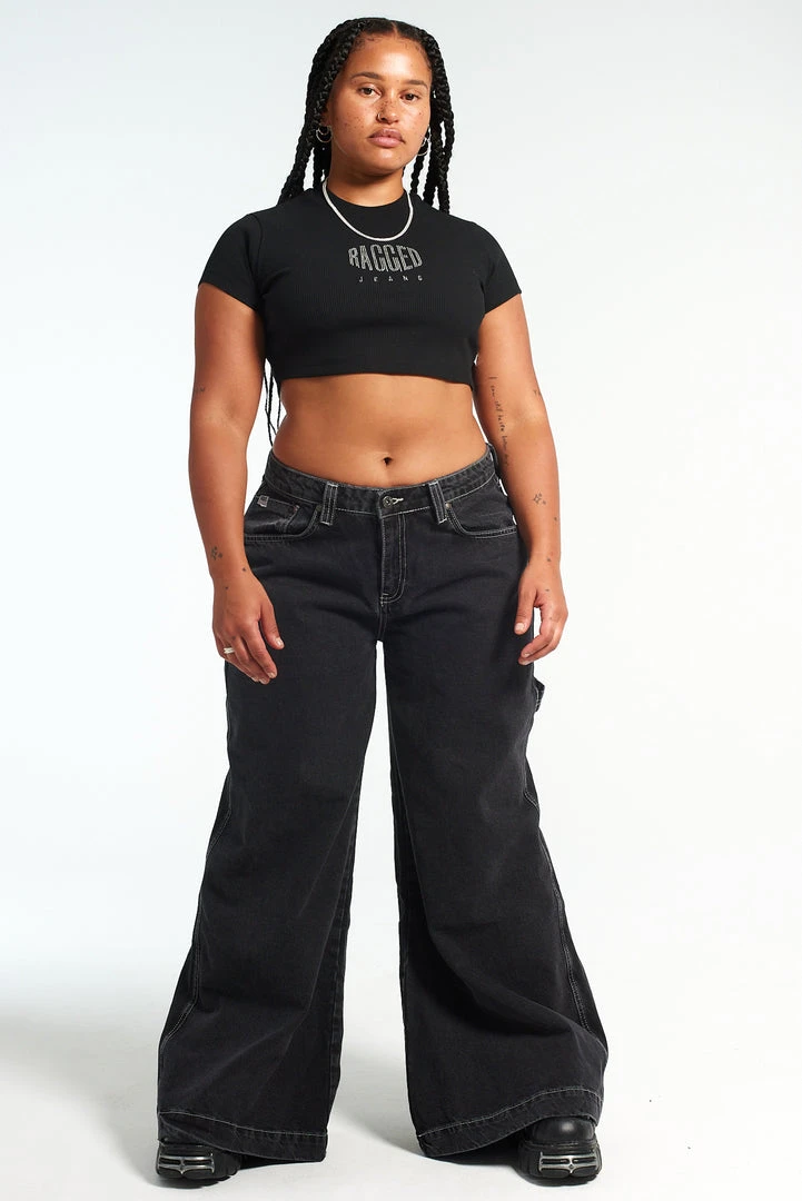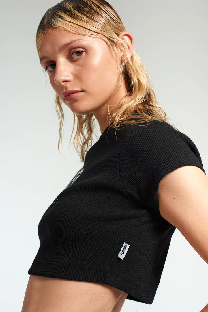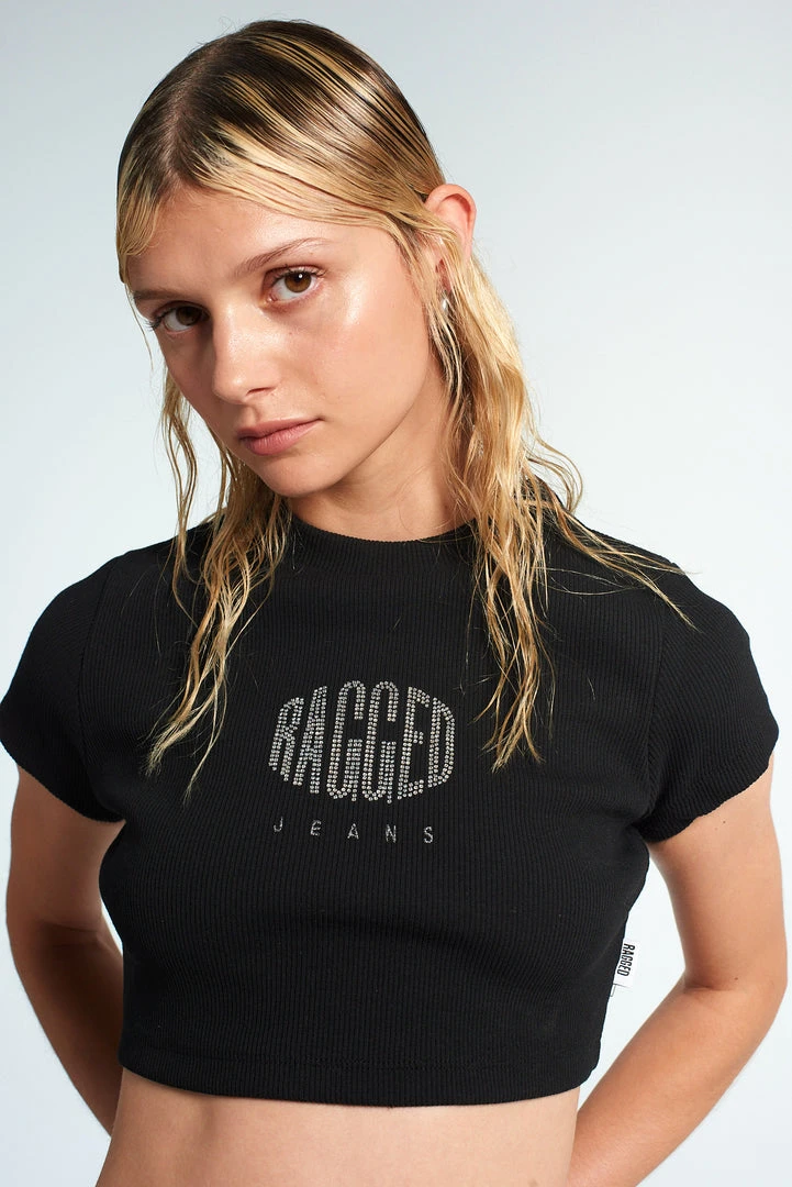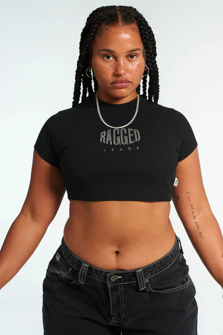 The Ragged Priest black short sleeved t-shirt cropped top with central “RAGGED” diamanté logo.Â