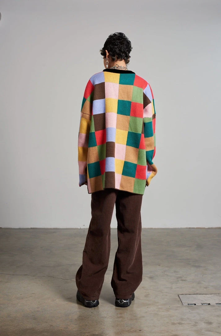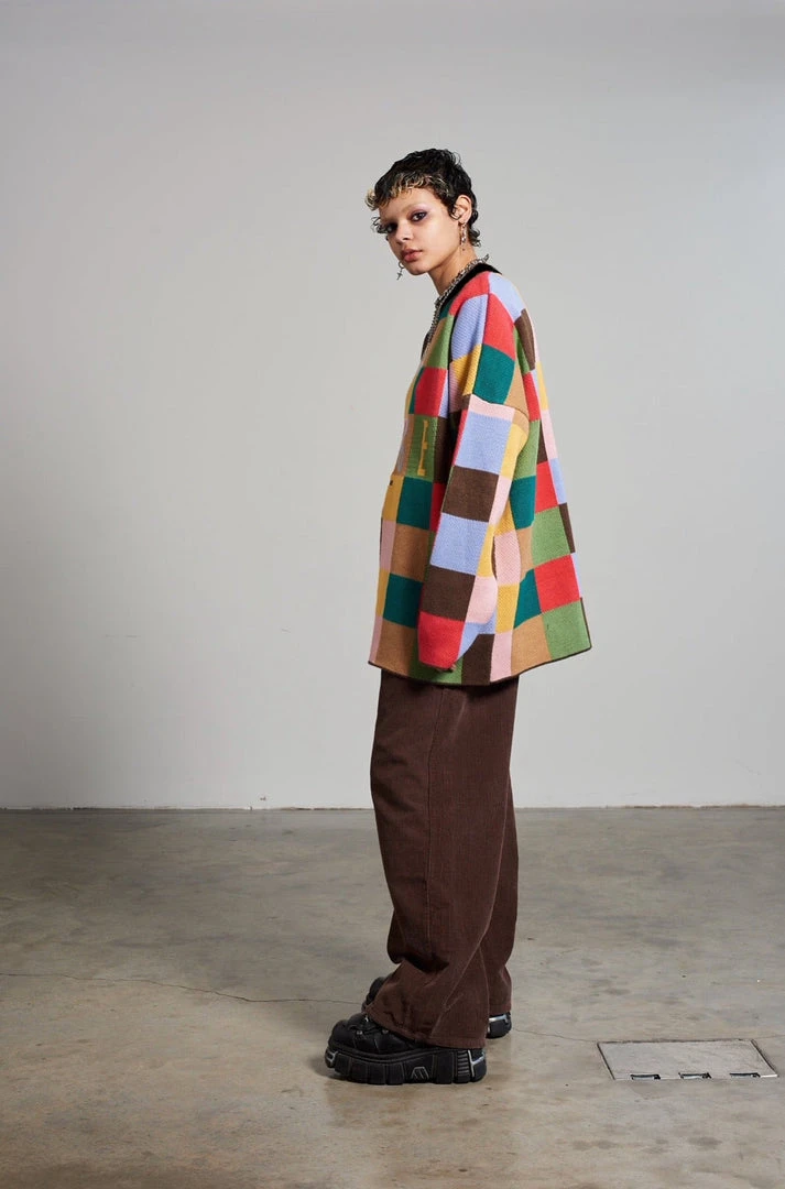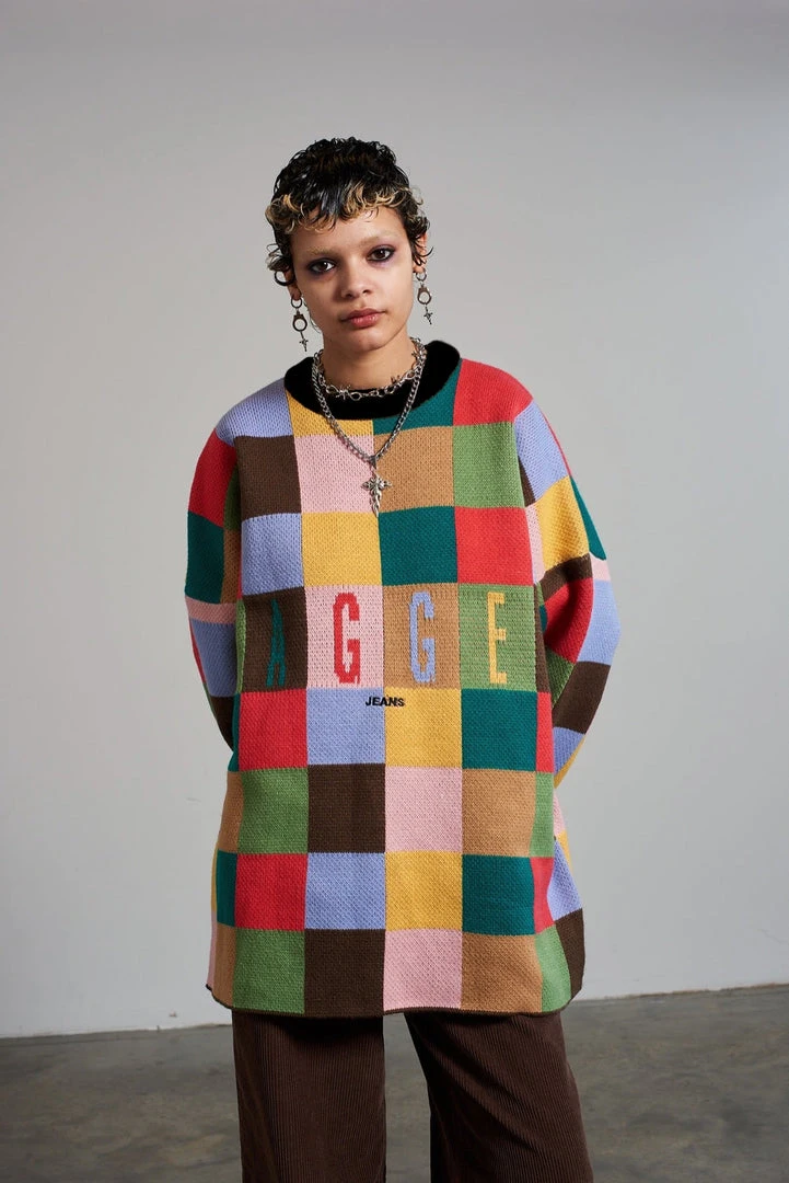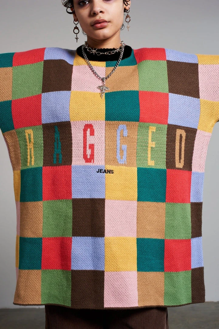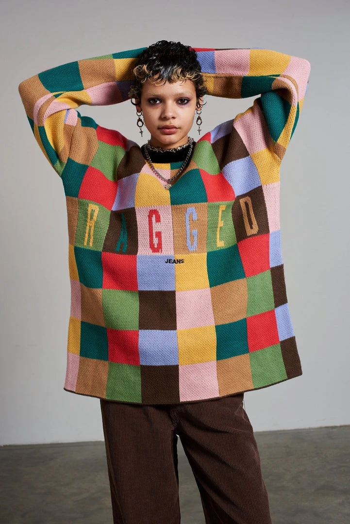 Ragged Jeans multicolour checkerboard oversized jumper with ‘Ragged Jeans’ chest logo.