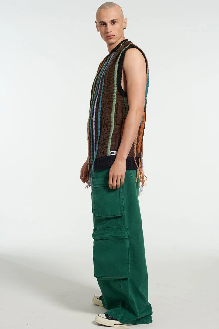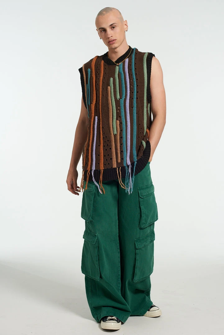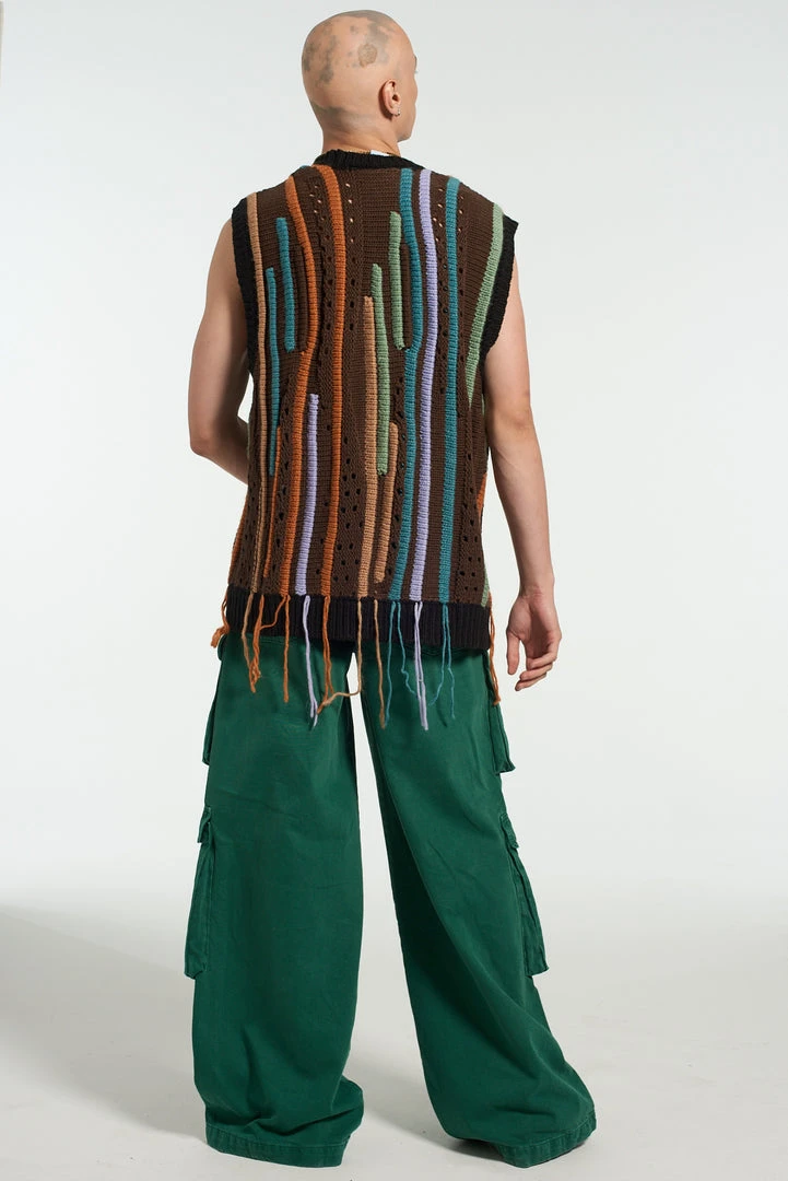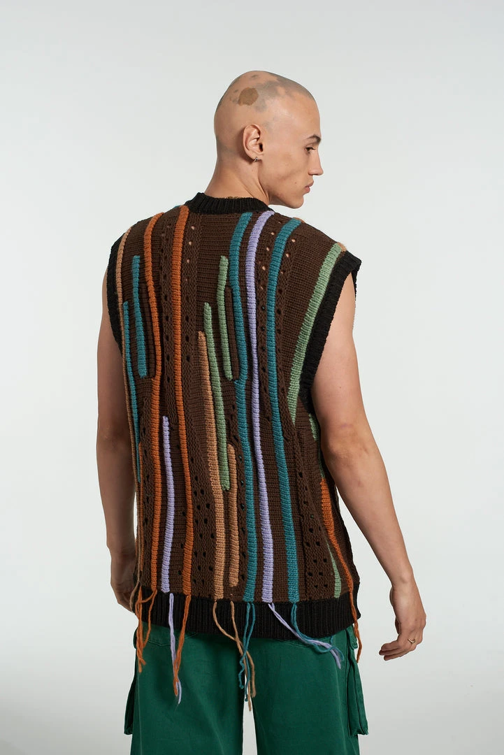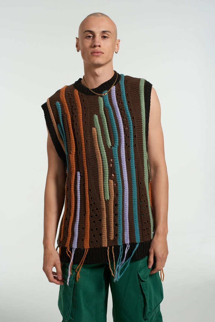Ragged Jeans mens brown knit vest with multicolour loose thread stipe detail.