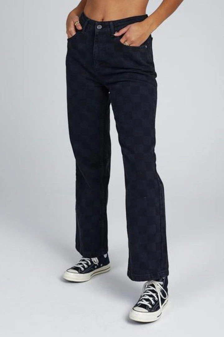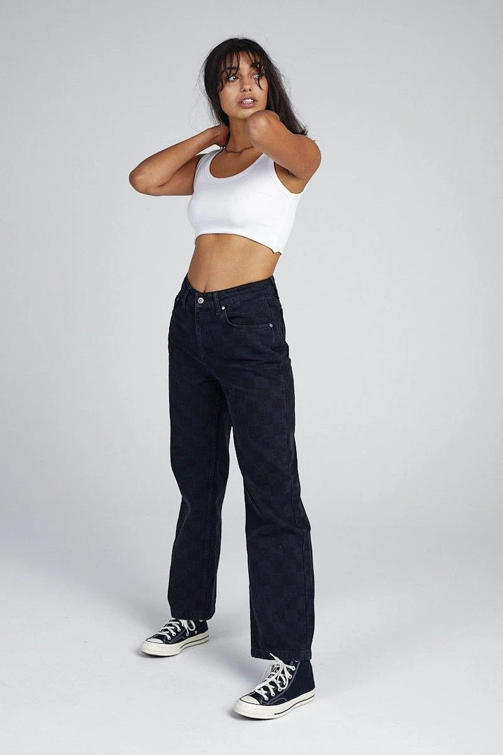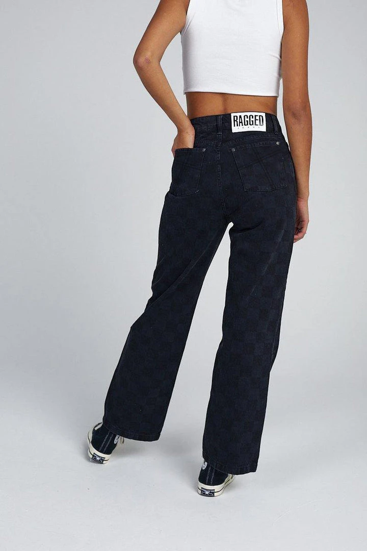 Ragged Jeans charcoal laser print checkerboard dad jeans. Featuring our “RAGGED Jeans” belt loop tab.
