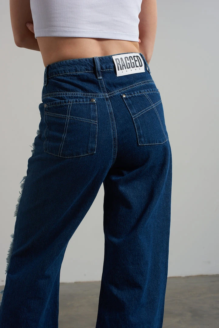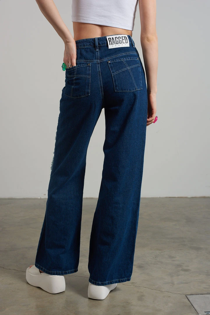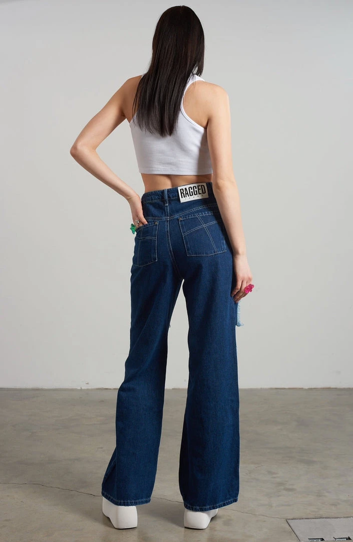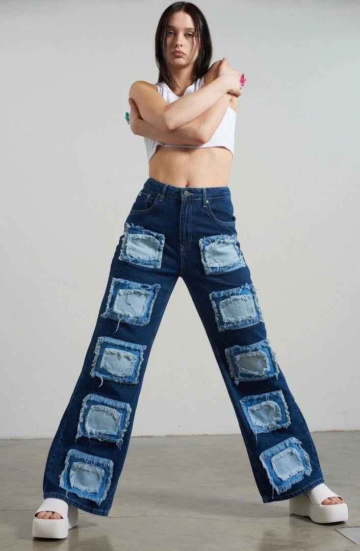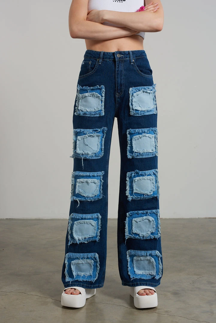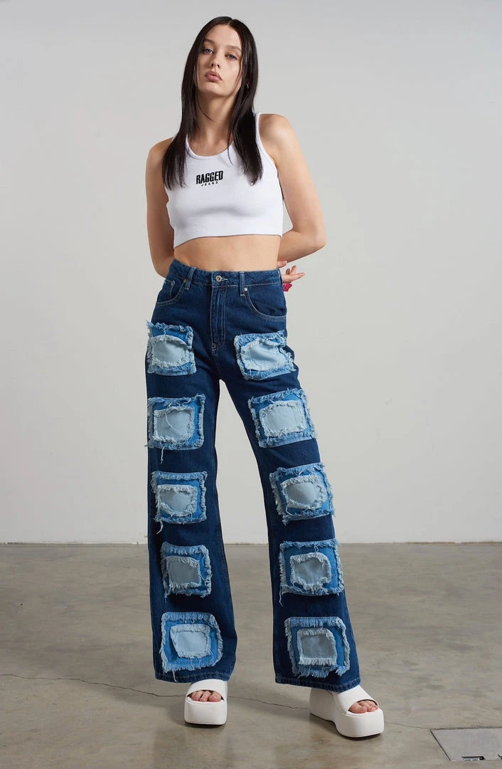 Ragged Jeans blue baggy denim jeans with appliqué squares detail.