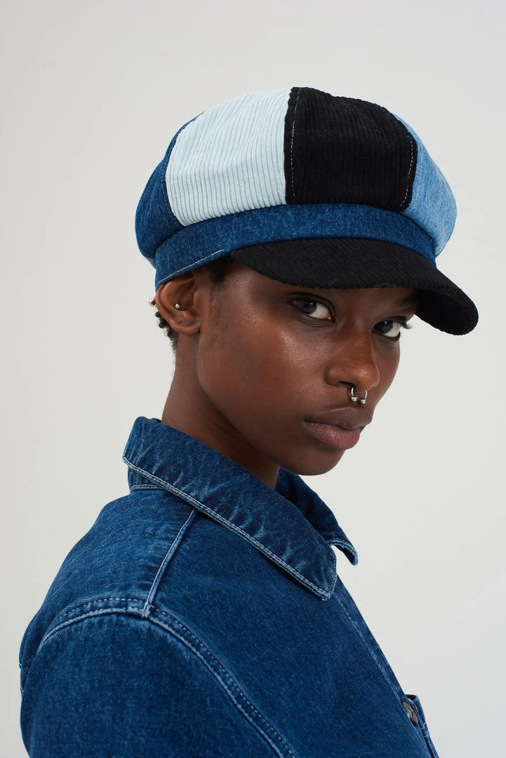 Ragged Jeans blue mixed cord & denim baker boy hat.