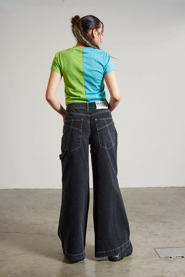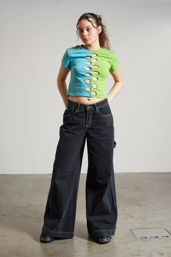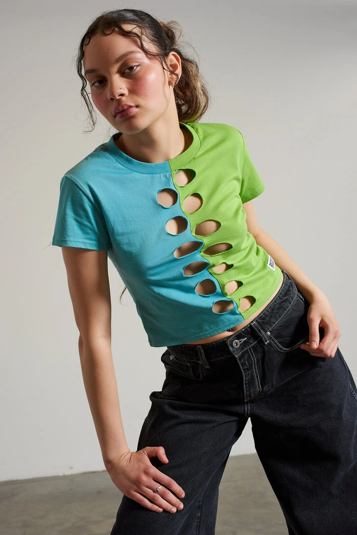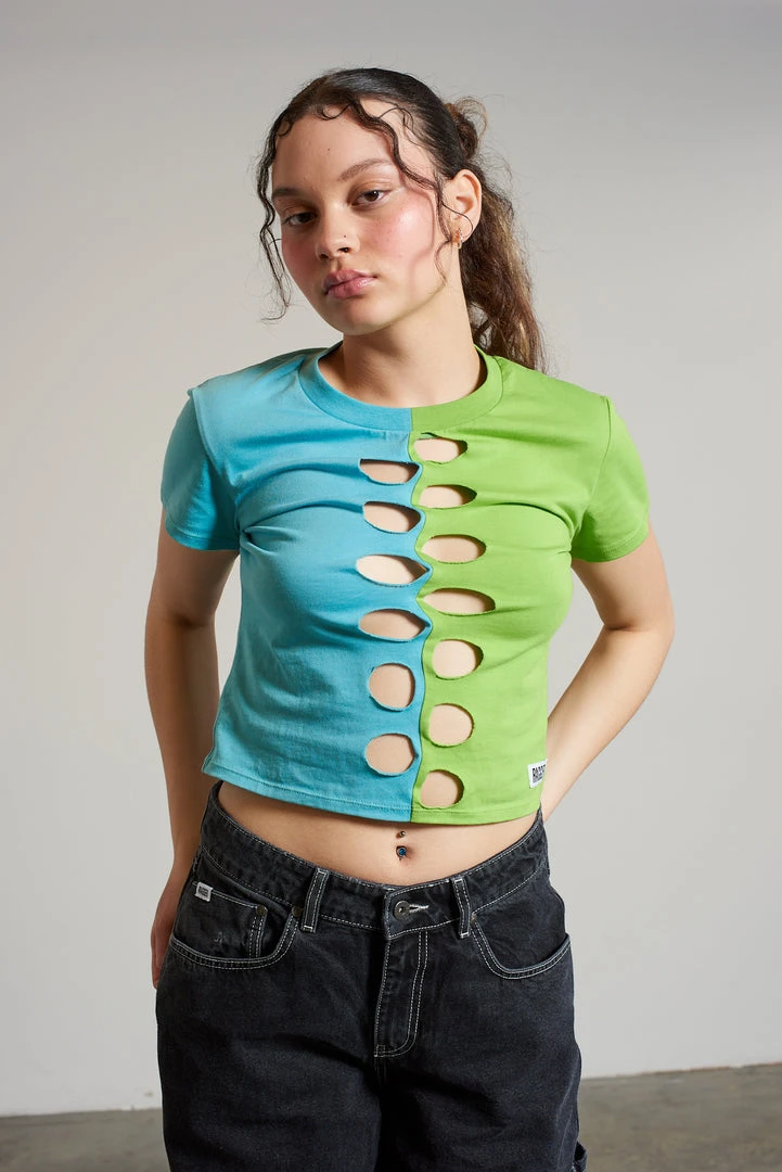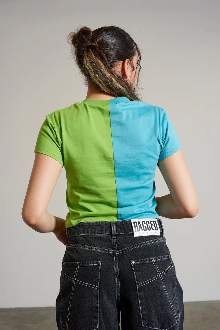 Ragged Jeans green and blue half and half short sleeve tee with cut out front detail.