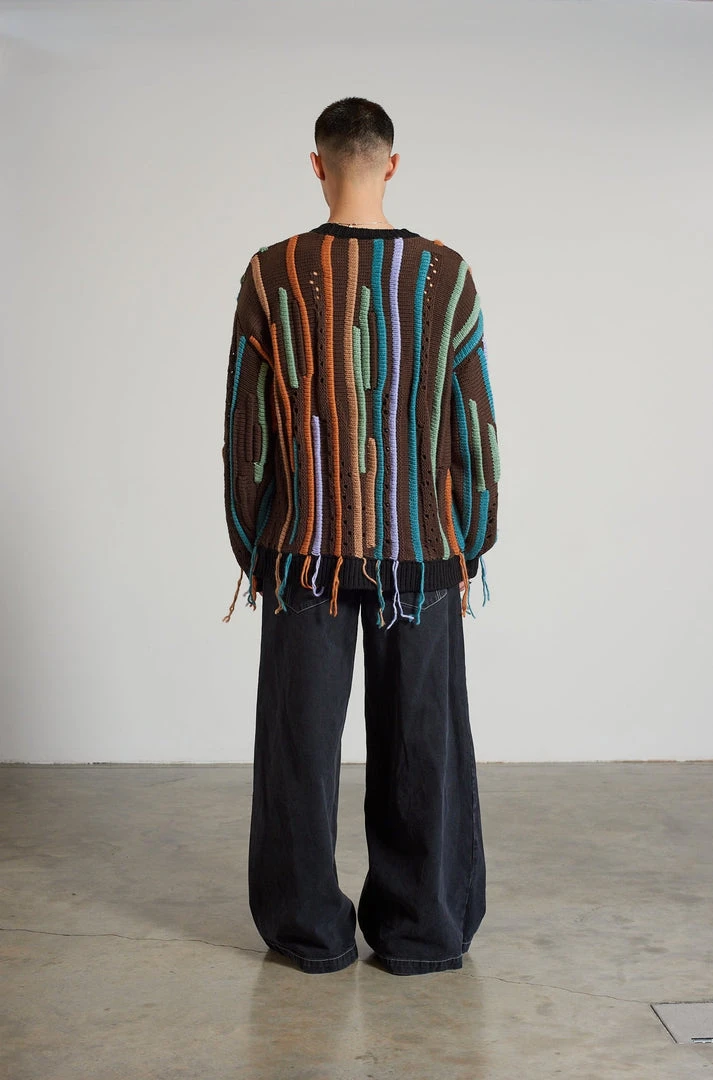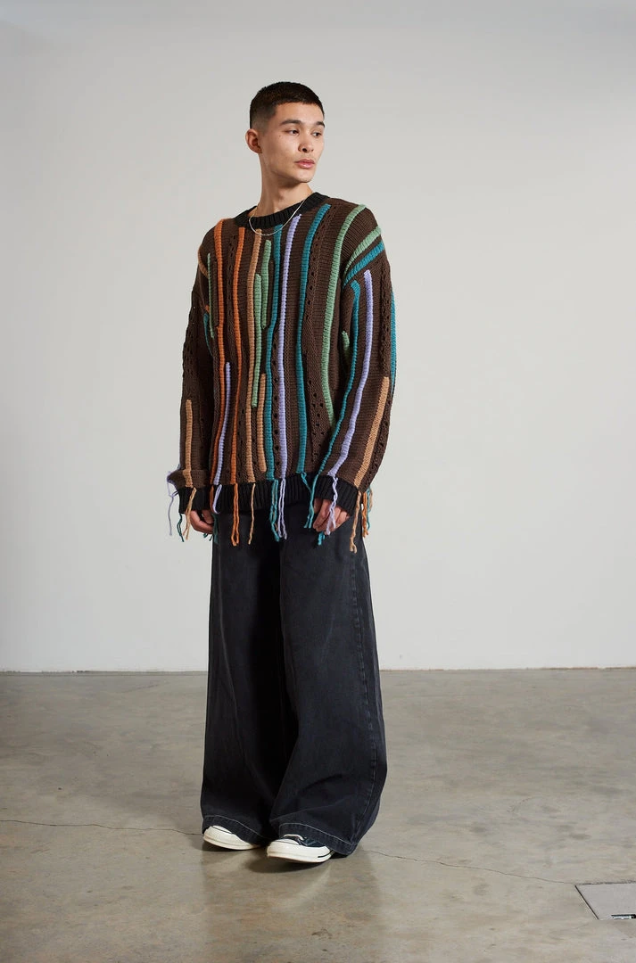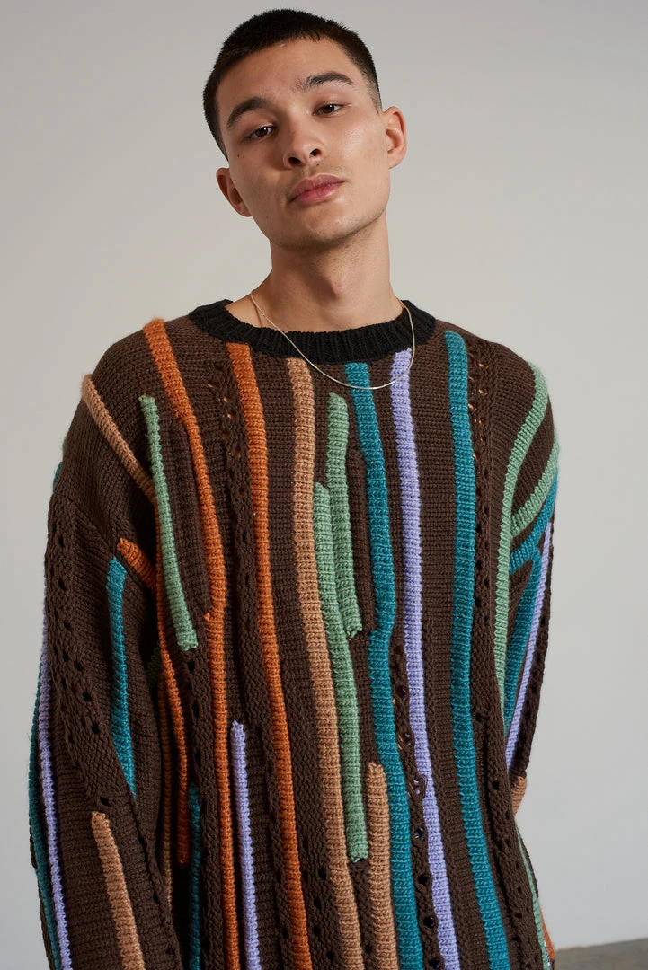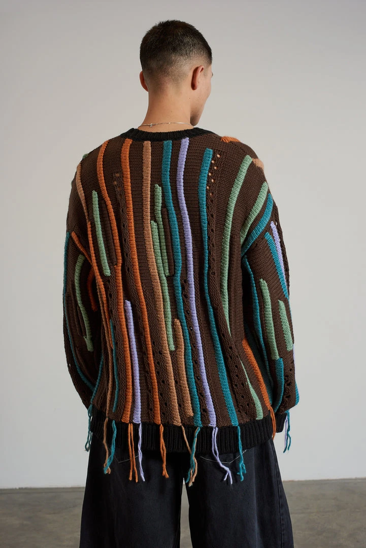 Ragged Jeans mens brown knit jumper with multicolour loose thread stipe detail.