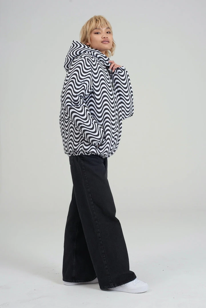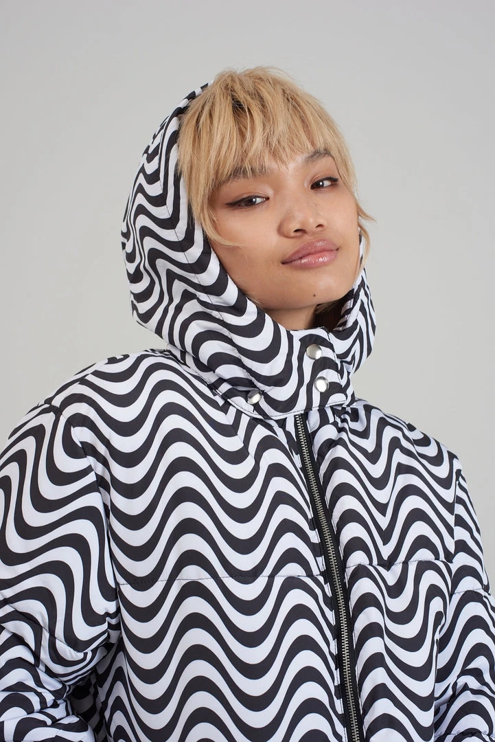 Ragged Jeans black & white wave pattern printed puffer coat with hood.