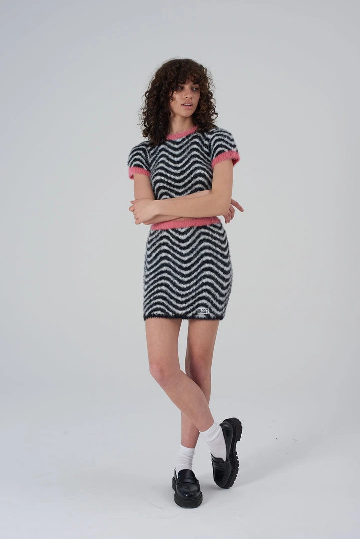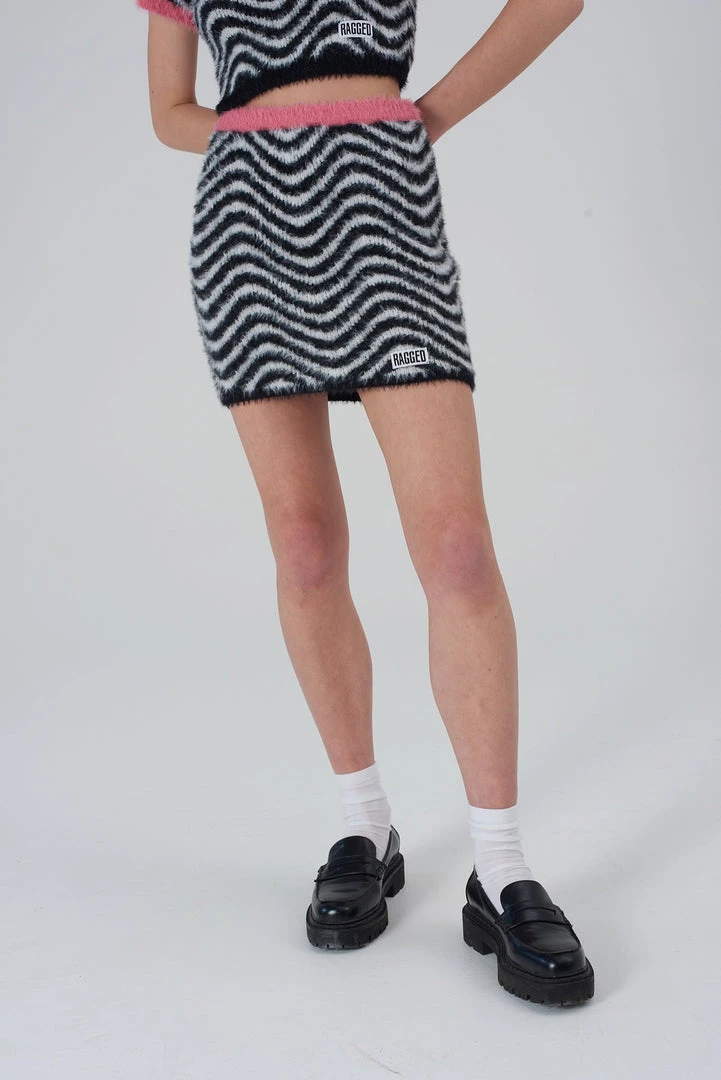 Ragged Jeans black & white wave pattern eyelash knit mini skirt.