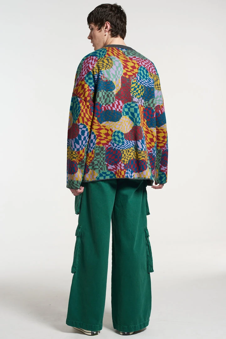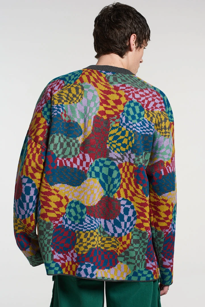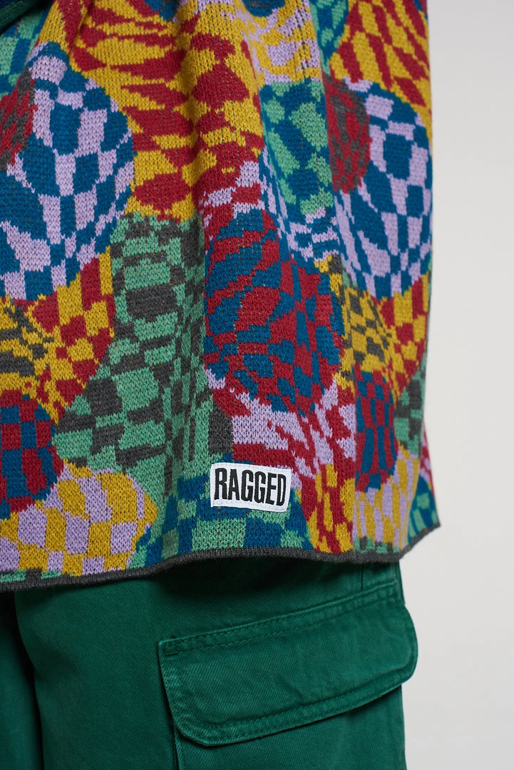 The Ragged Priest men’s knitted warped psychedelic checkerboard multicoloured printed knit.
