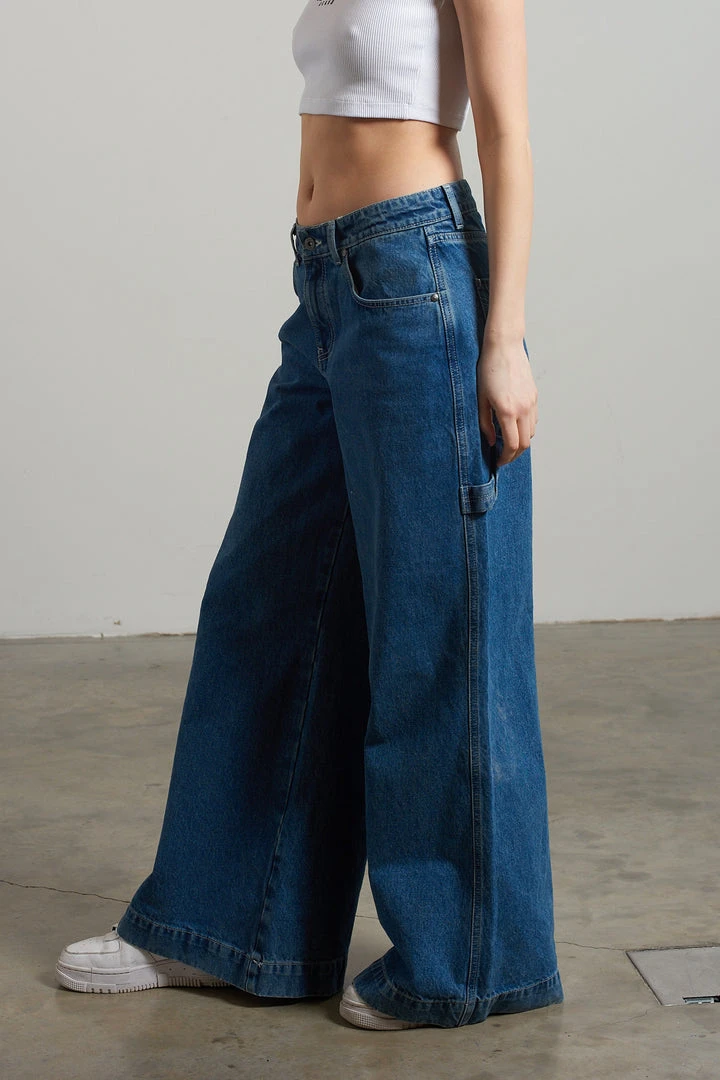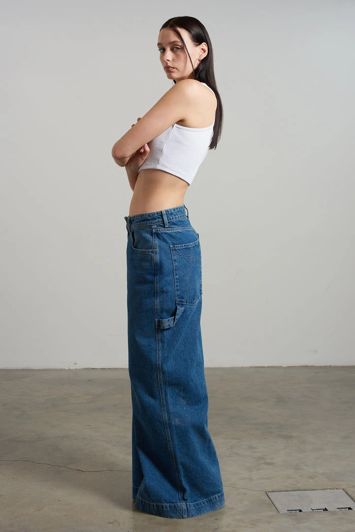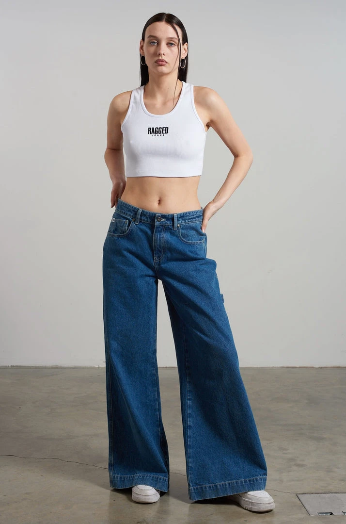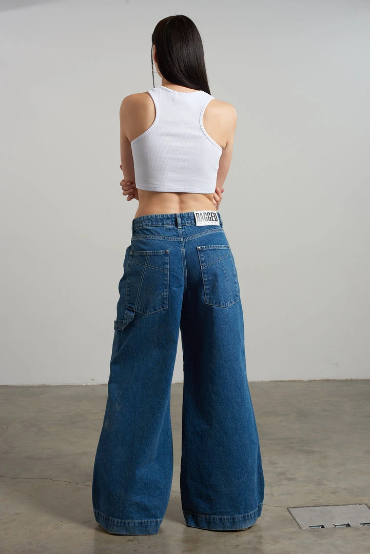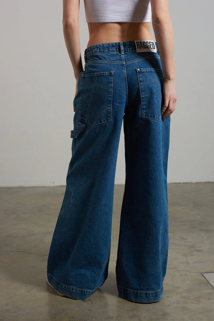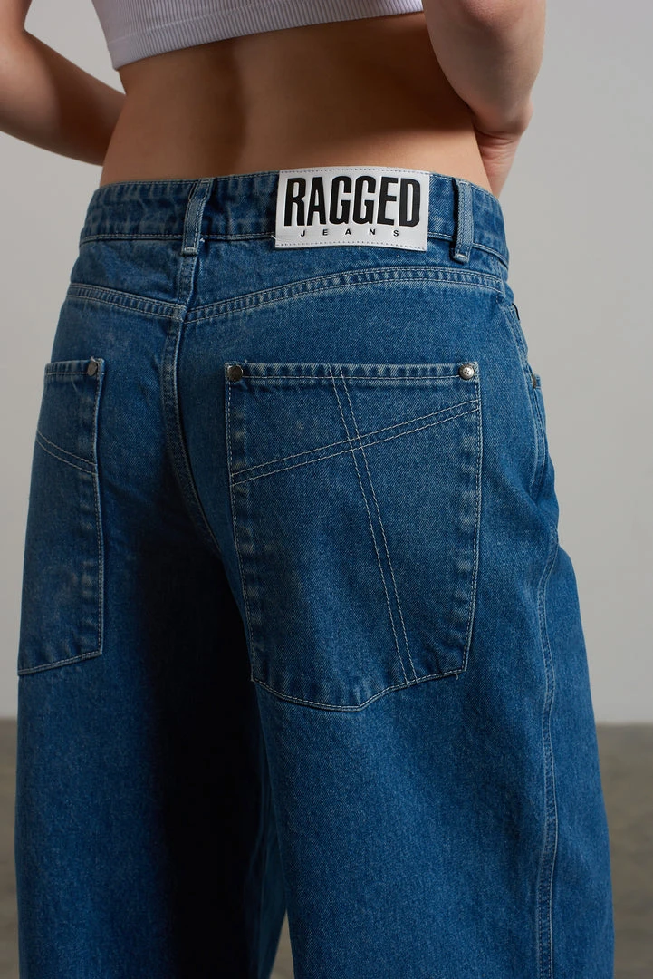 The Ragged Priest signature Sweeper Jean fit in our mid blue wash organic denim with classic “Ragged Jeans” belt loop back tab.