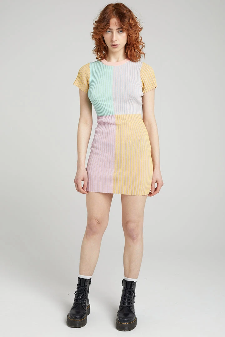 RaggedΒ JeansΒ short sleeve quarter panel ribbed colour blockΒ knittedΒ dress with contrast yellow sleeves andΒ green neckline.