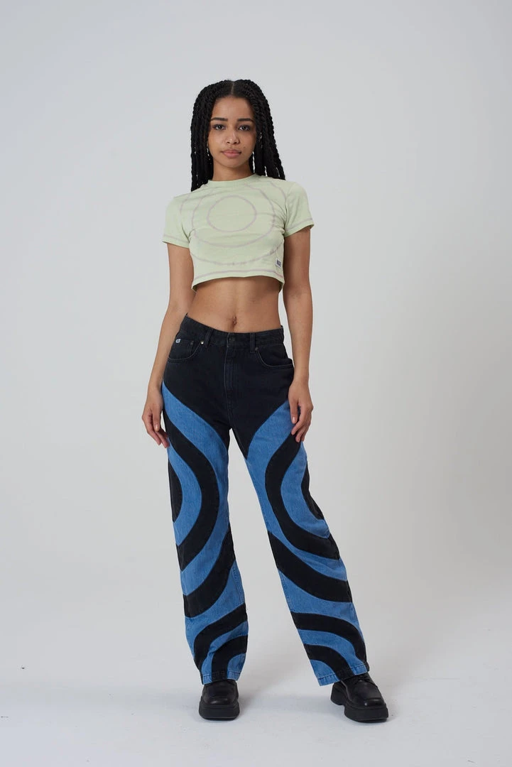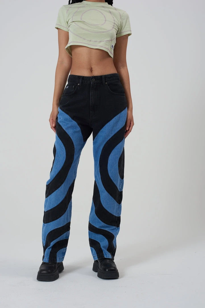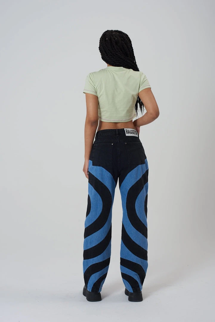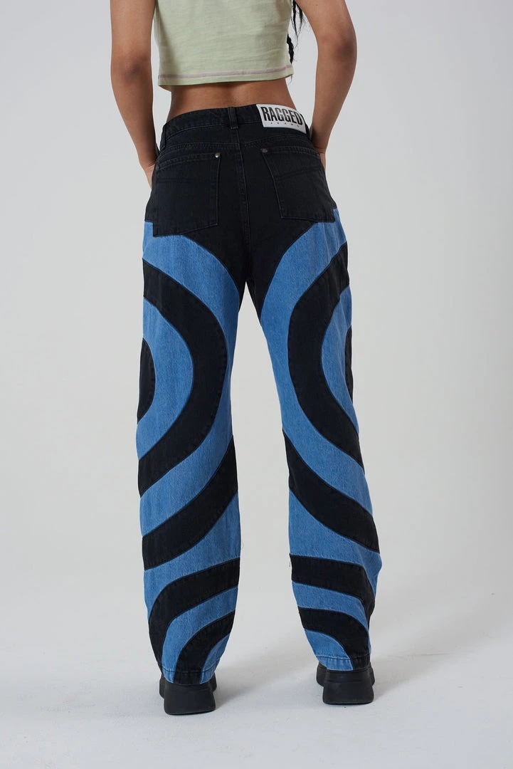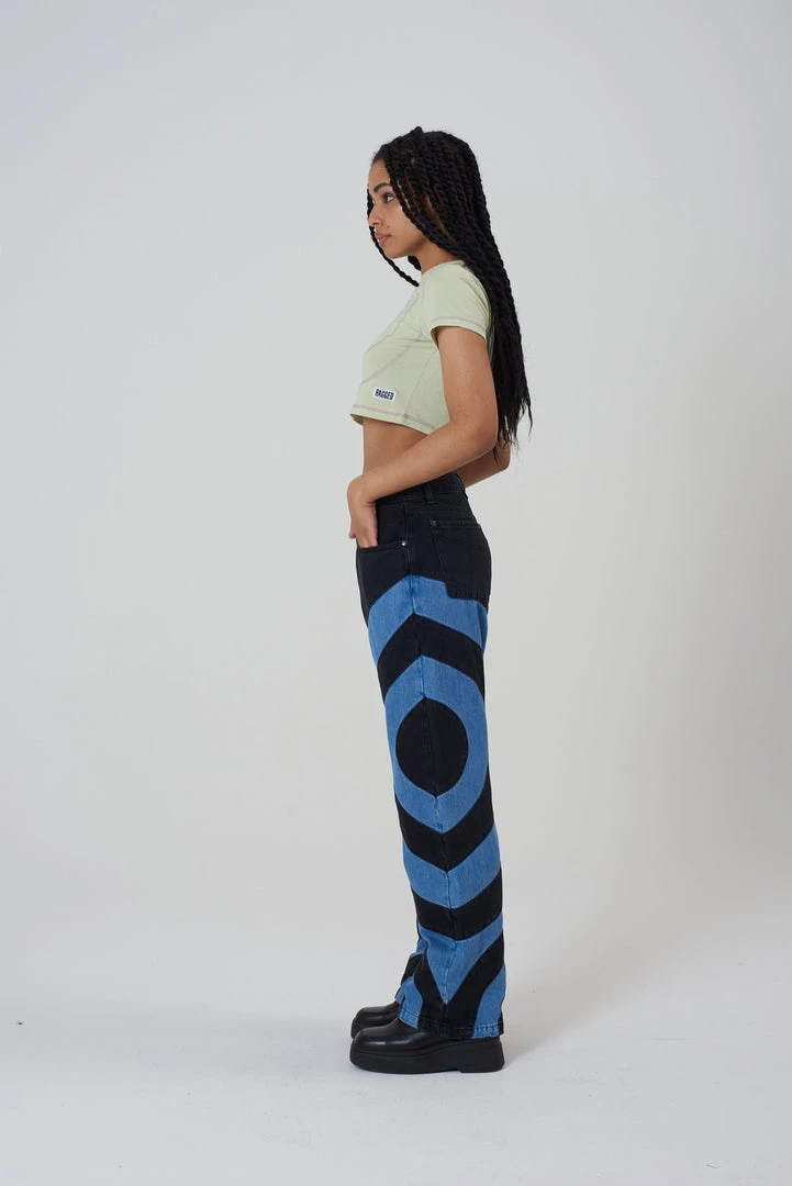 Ragged Jeans charcoal denim dad jeans with blue circle panels.