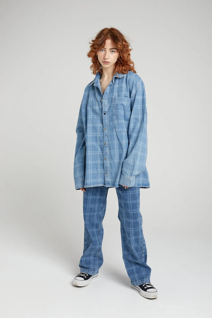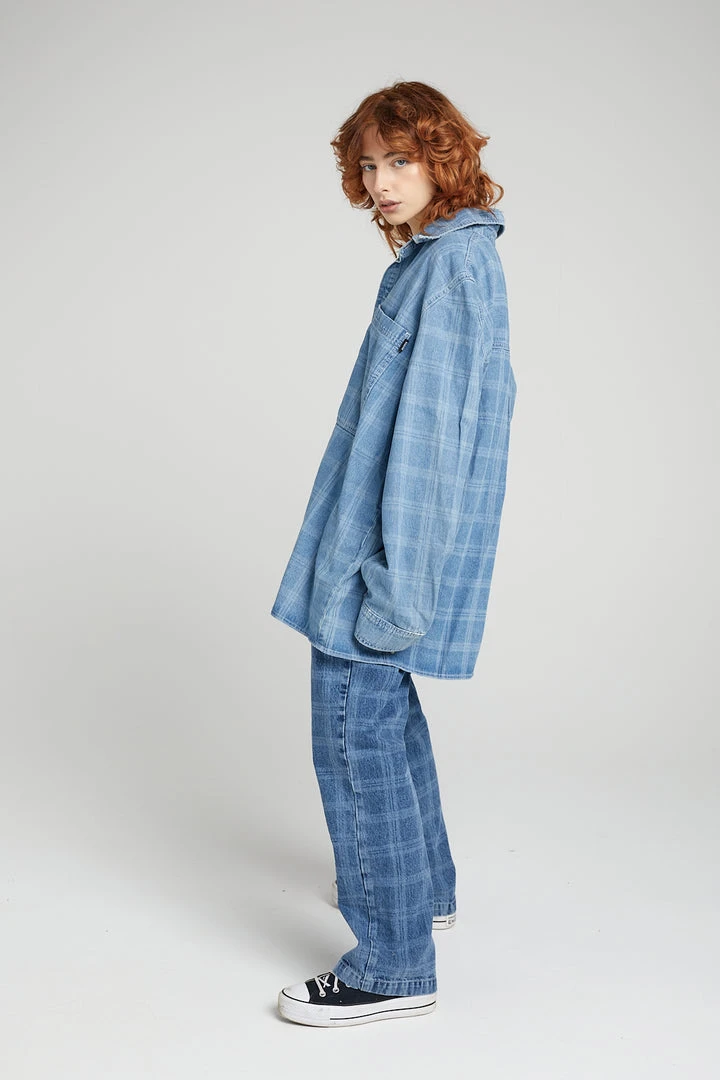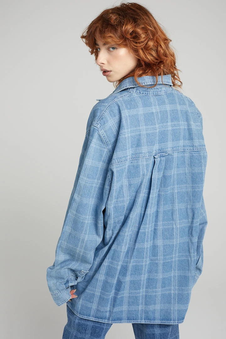Ragged Jeans oversized blue laser check chambray shirt with “RAGGED Jeans” small fabric pocket tab and front pocket.