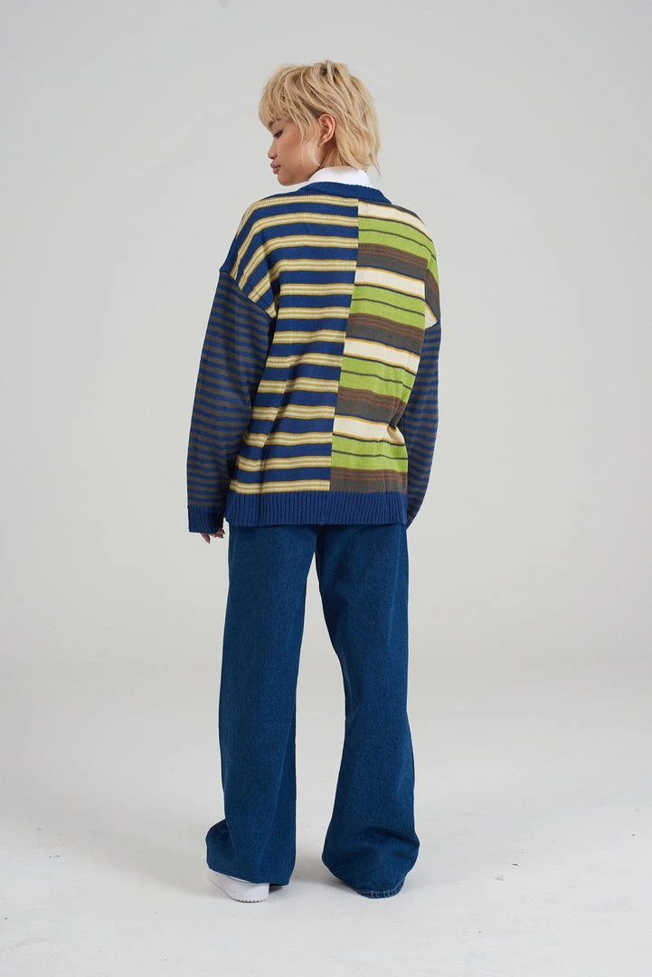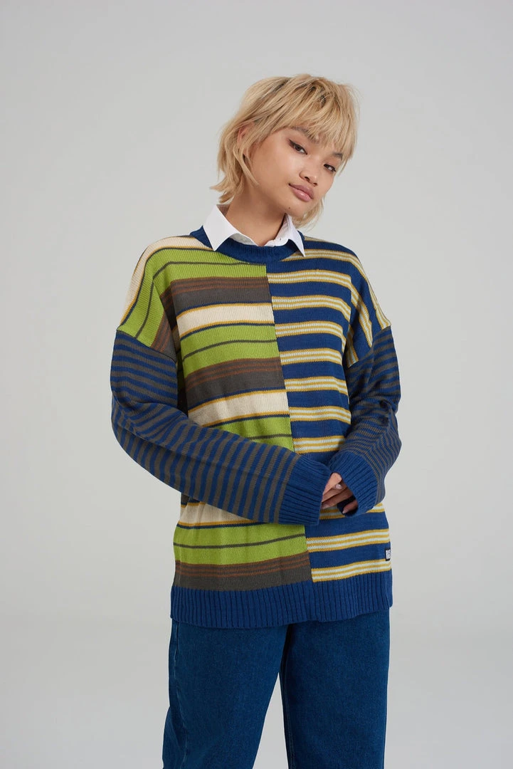 Ragged Jeans unisex mixed stripe panelled long sleeve knitted jumper.