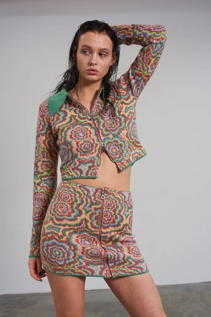 The Ragged Priest multi colour trippy floral jacquard knitted skirt with front zip detail.