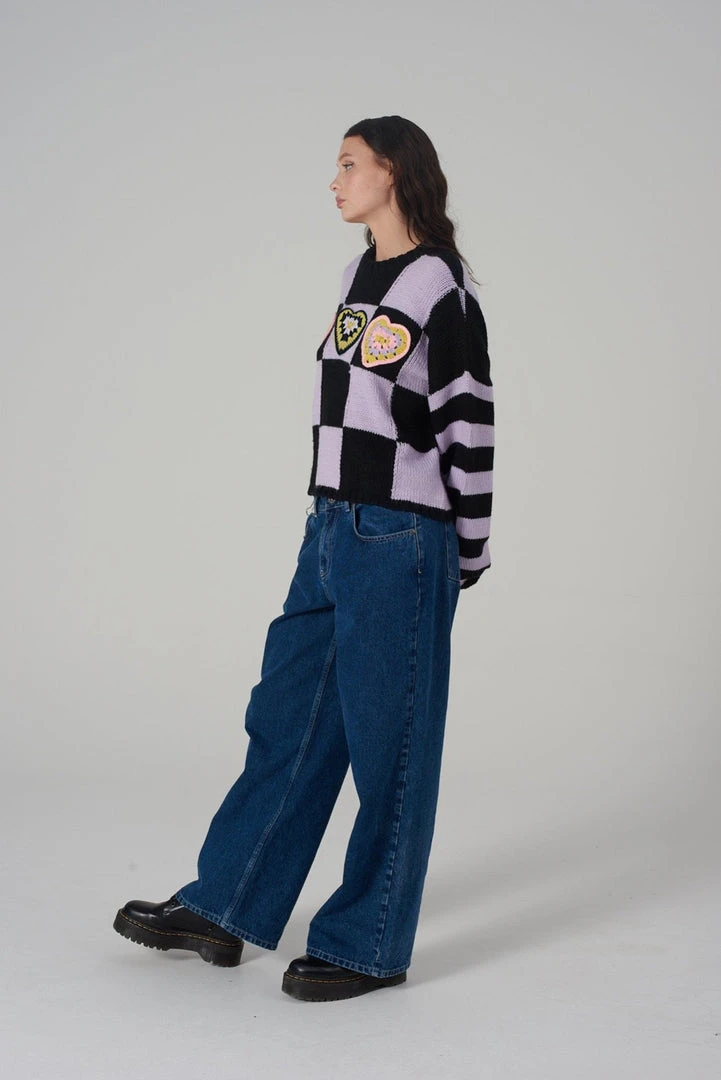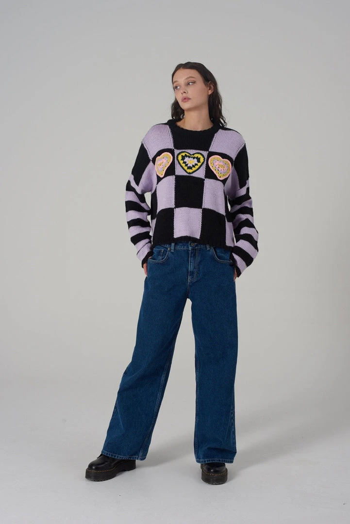 The Ragged Priest black & lilac checkerboard oversized knit jumper with crochet heart detail.
