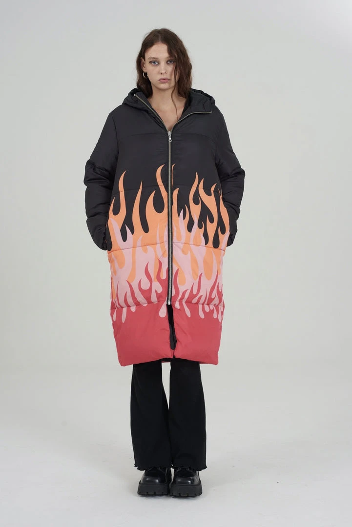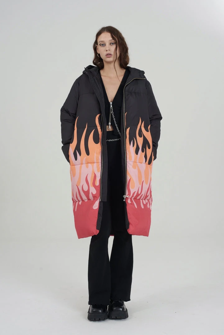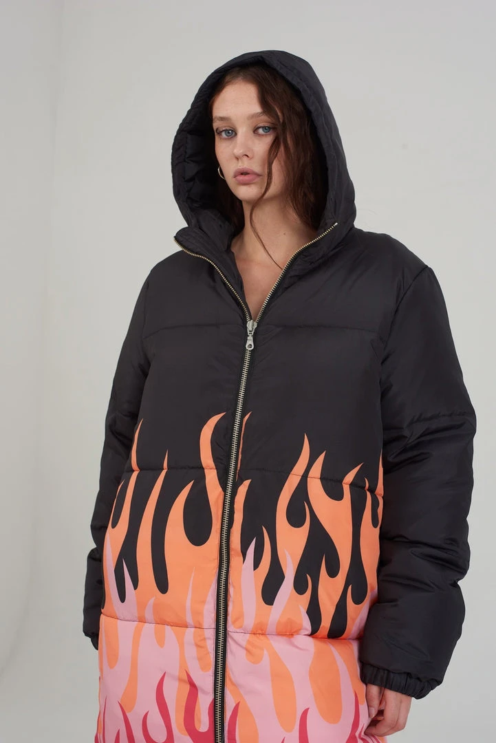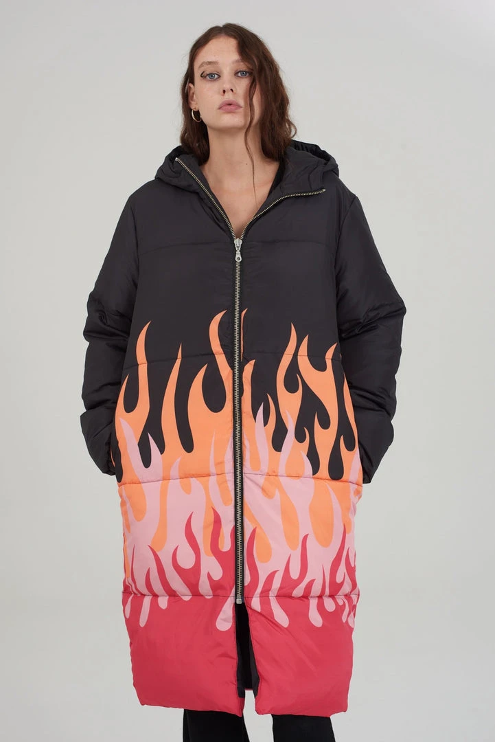 The Ragged Priest black long line puffer coat with flame print.