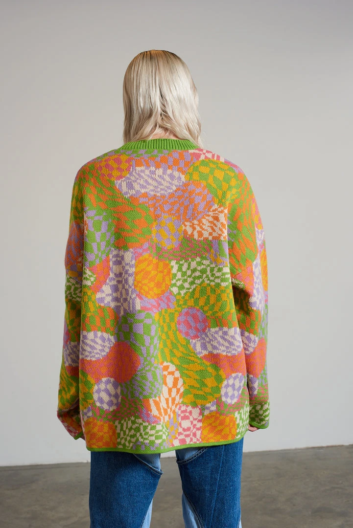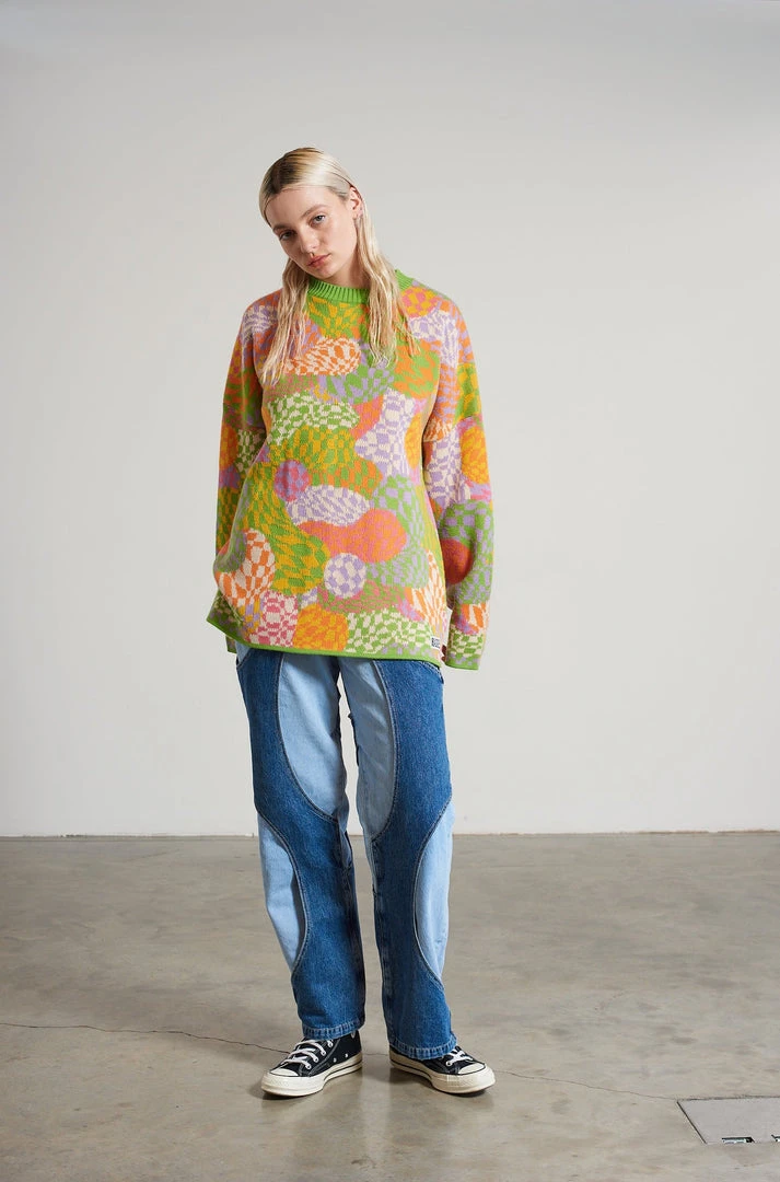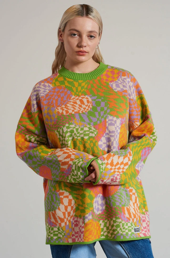 Ragged Jeans psychedelic jacquard knit jumper with green trims.