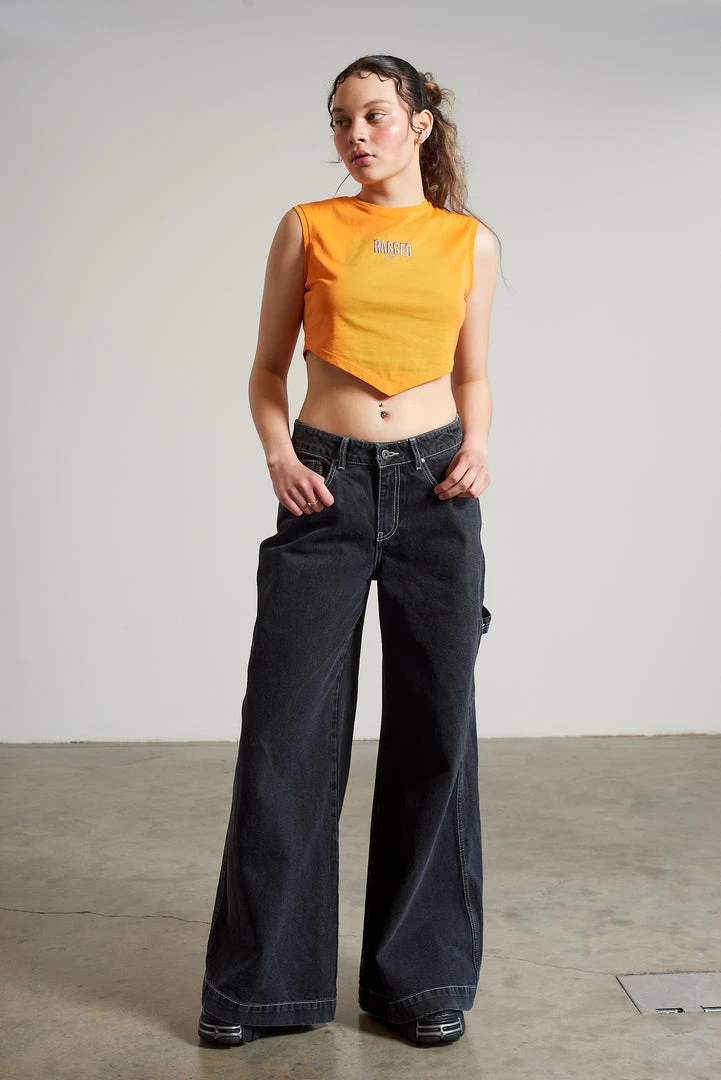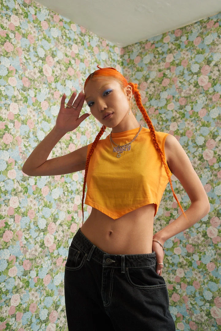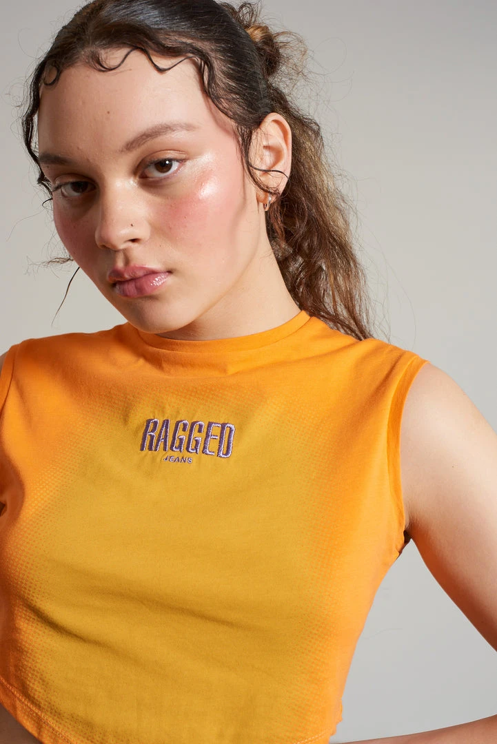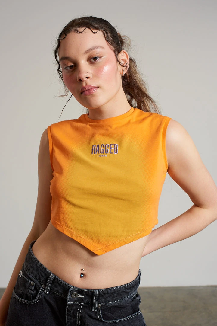 Ragged Jeans orange handkerchief hem vest top with yellow over dye and logo.