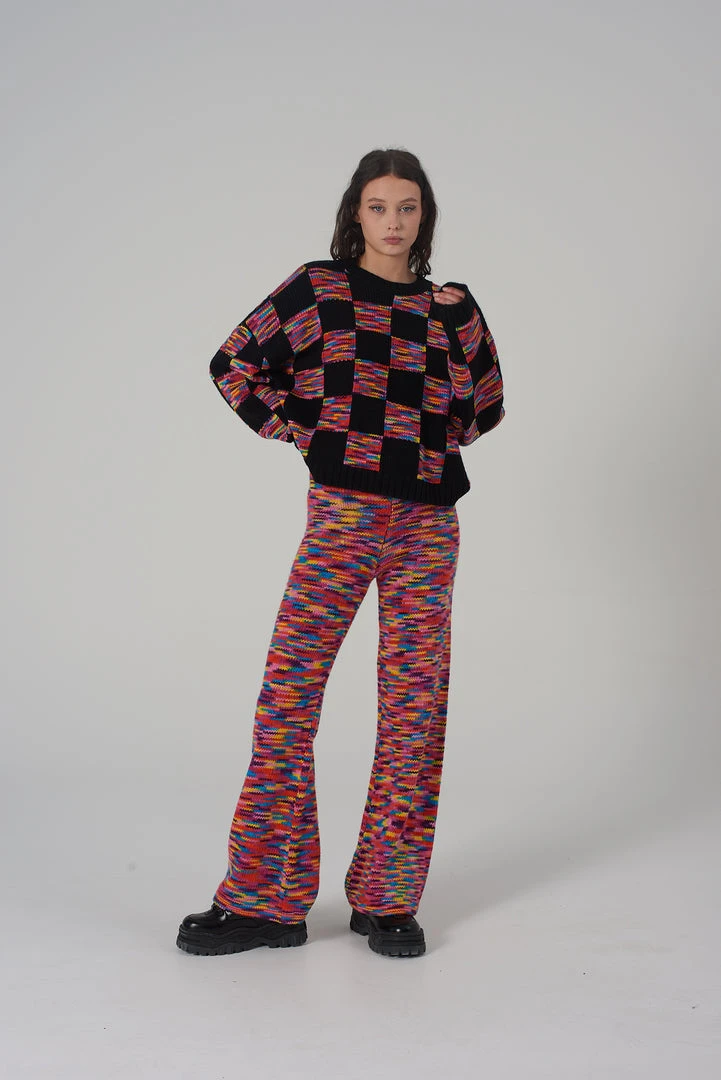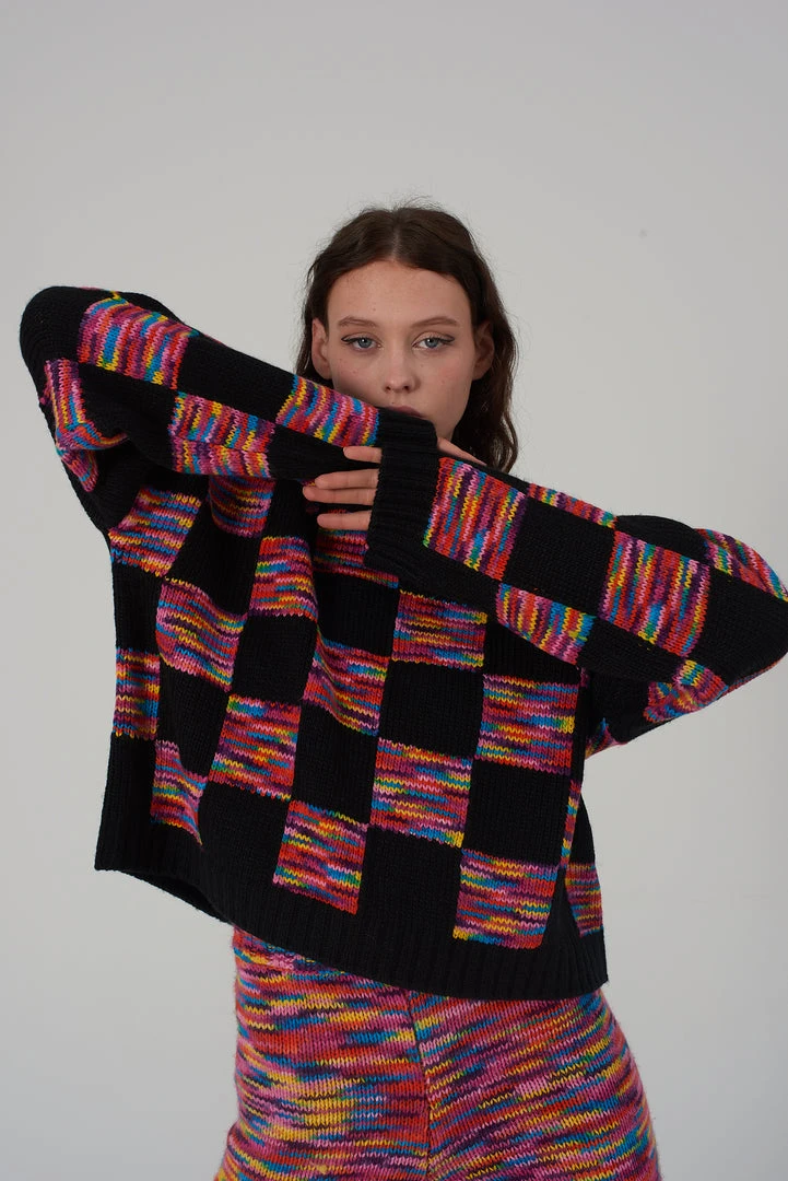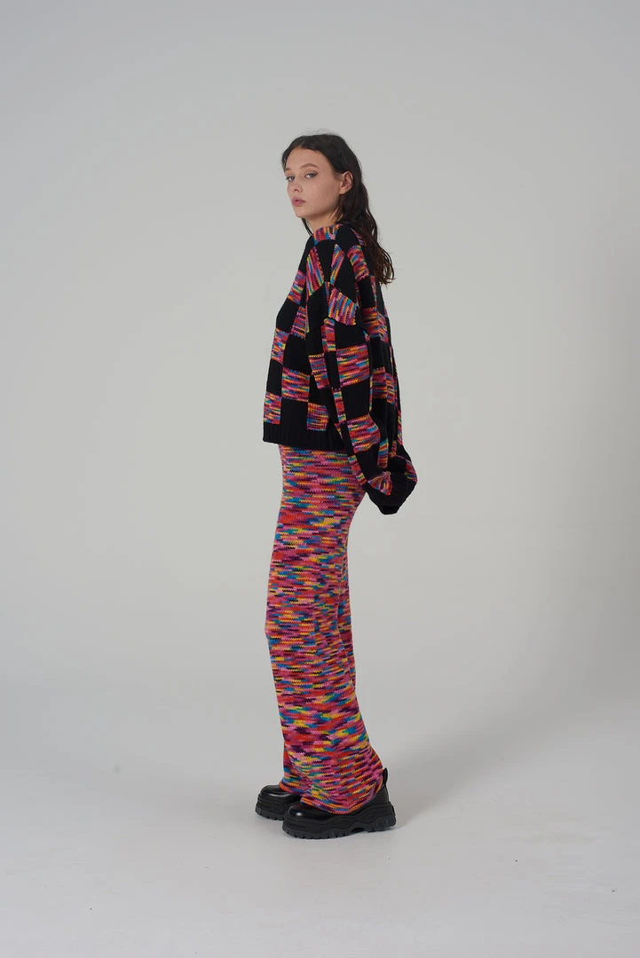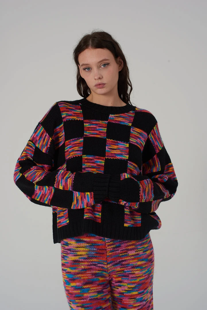 The Ragged Priest multicolour space dye panelled knit jumper.