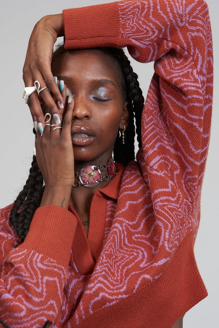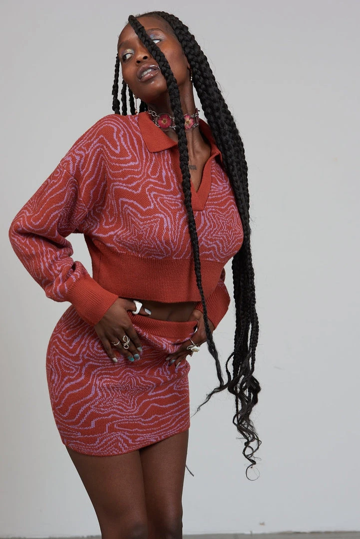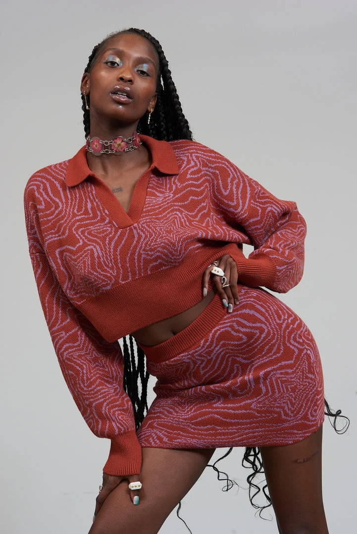 The Obscure Top is our knitted crop top with all over wavy line star print. This top is crafted from 100% recycled polyester and features a collared V neck line and is part of a co-ord set.