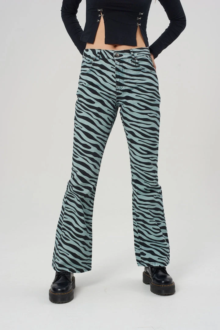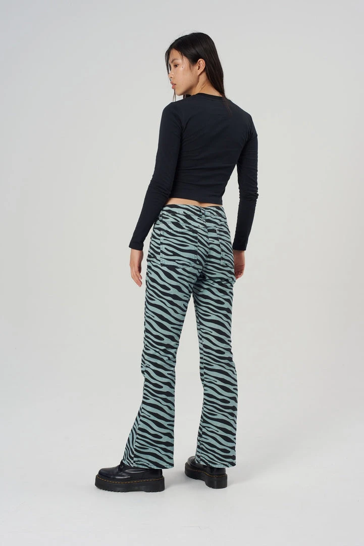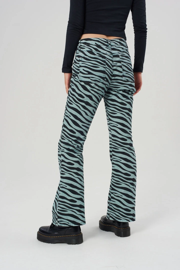 The Wild Jeans are our blue tiger print denim flared jeans. Crafted from 100% organic cotton.