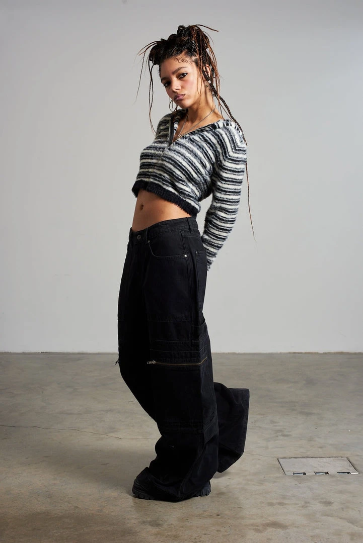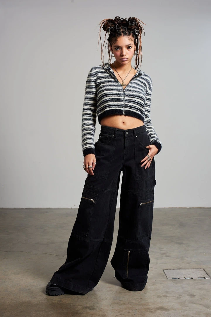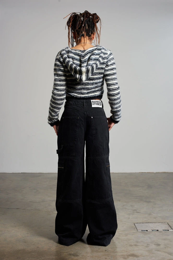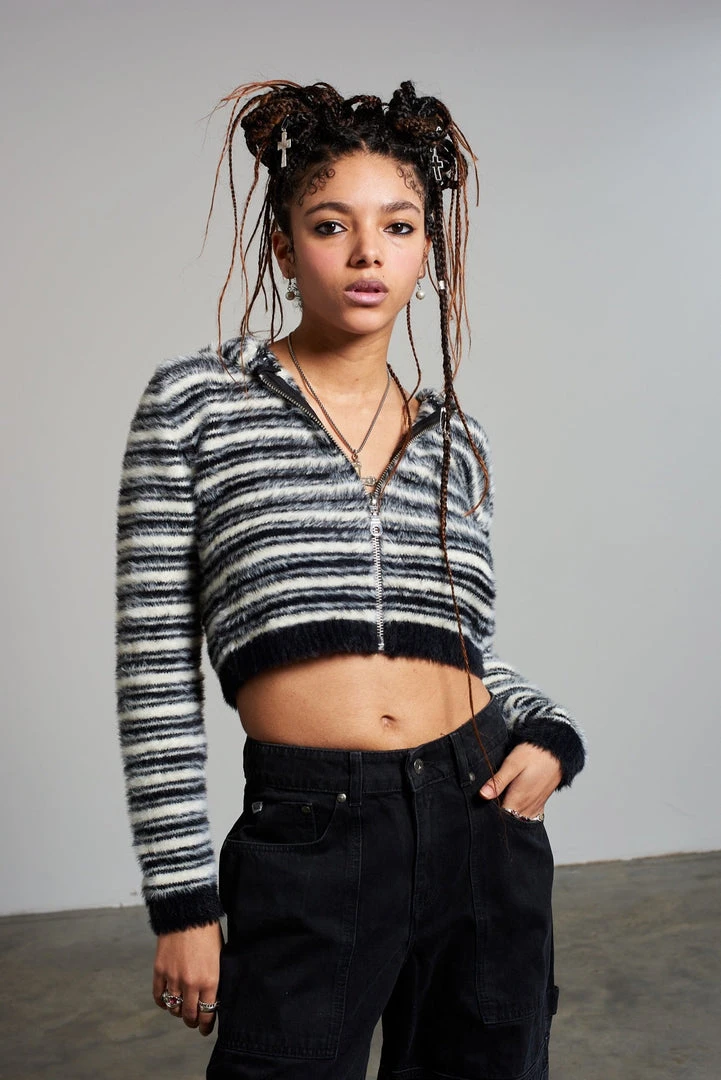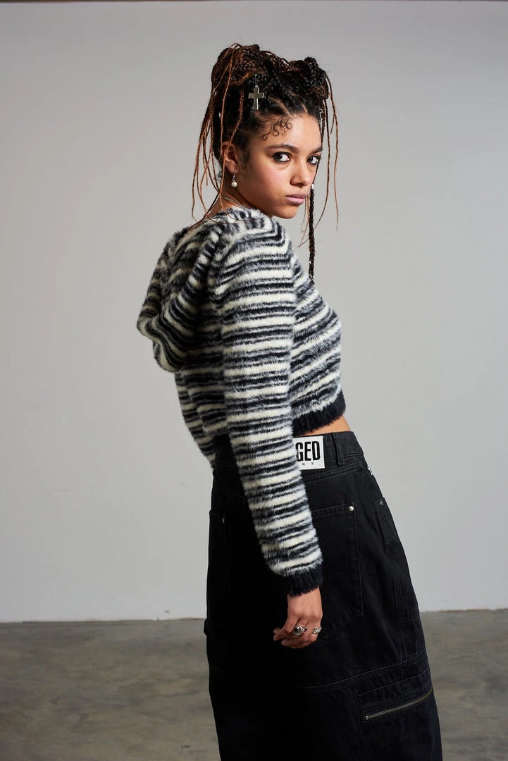 Ragged Jeans black & white stripped eyelash knit hoodie ‘Ragged Jeans’ tab logo and zip fastening.