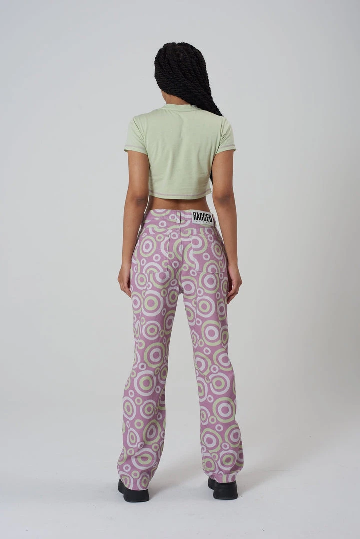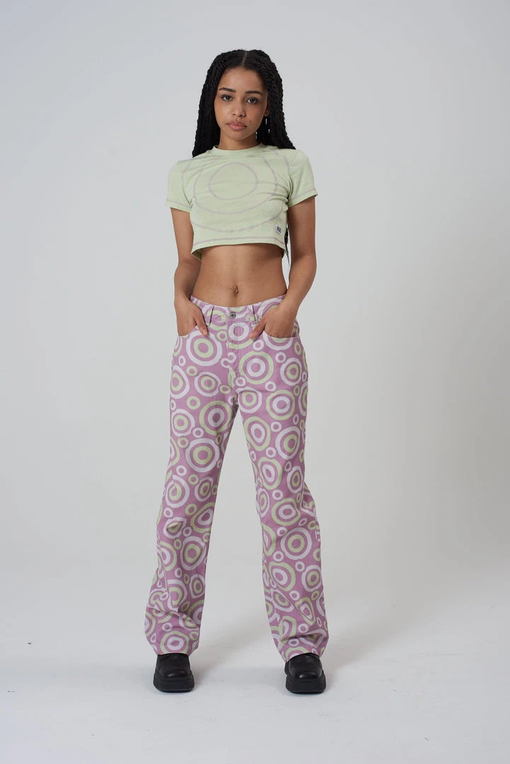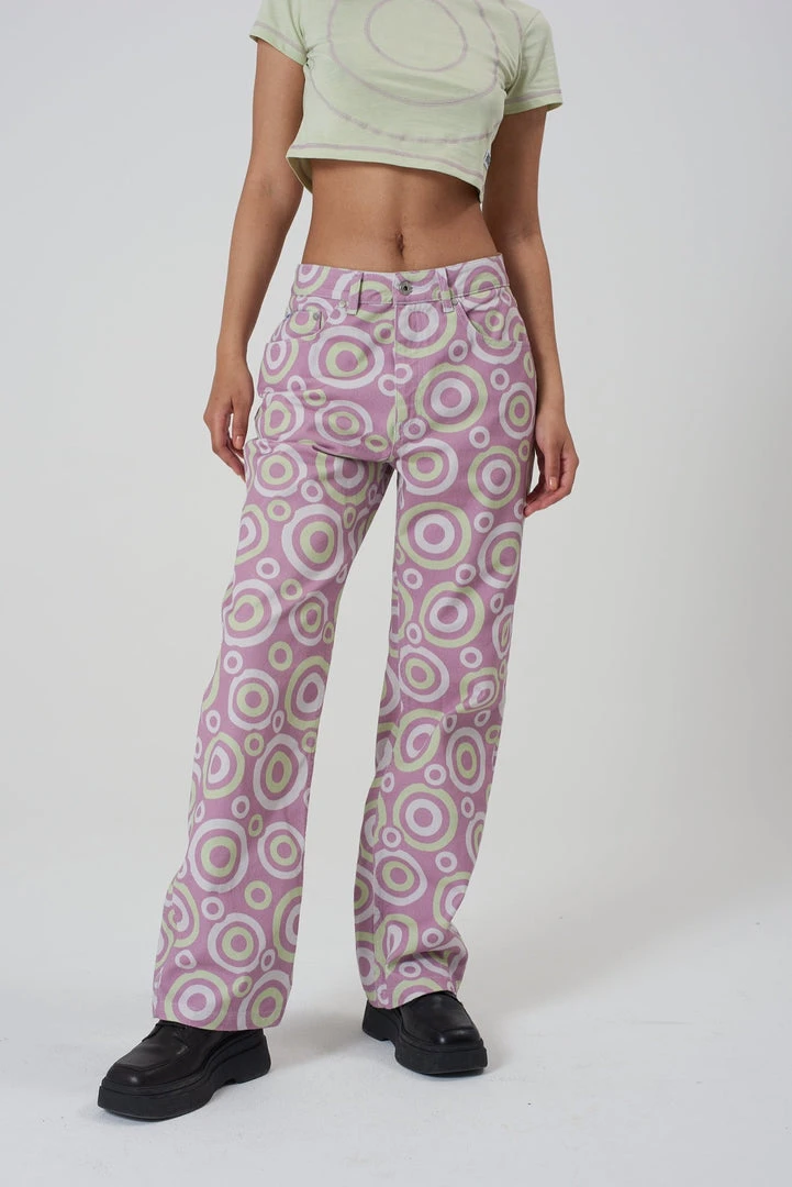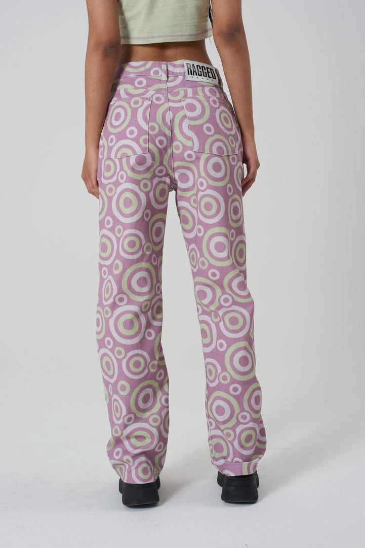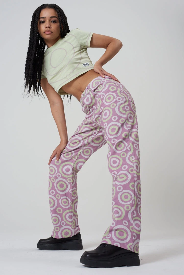 Ragged Jeans lilac denim dad jeans with all over green circle print.