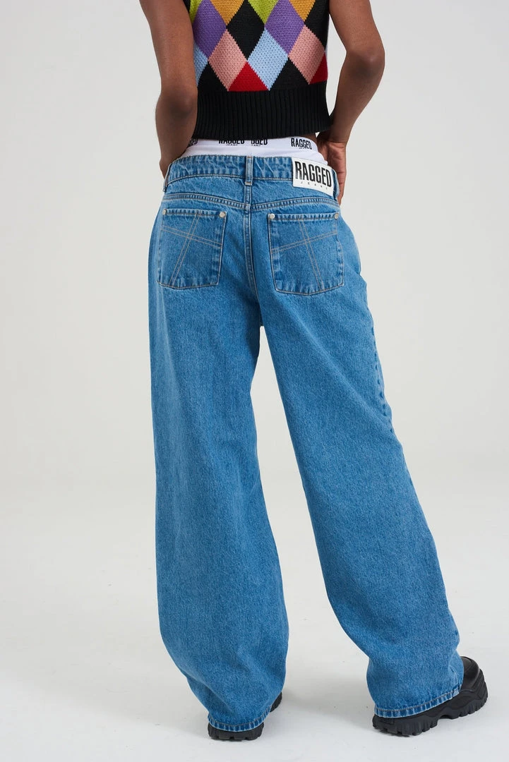 Ragged Jeans blue baggy skater style low-rise jeans with knee cut detail.