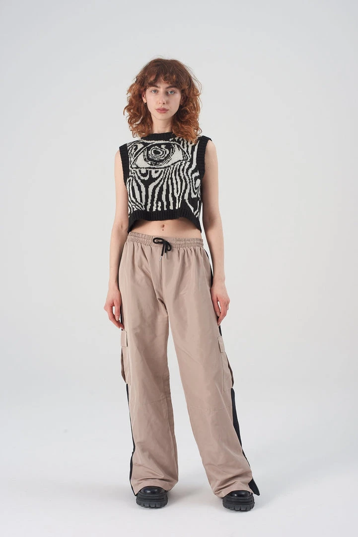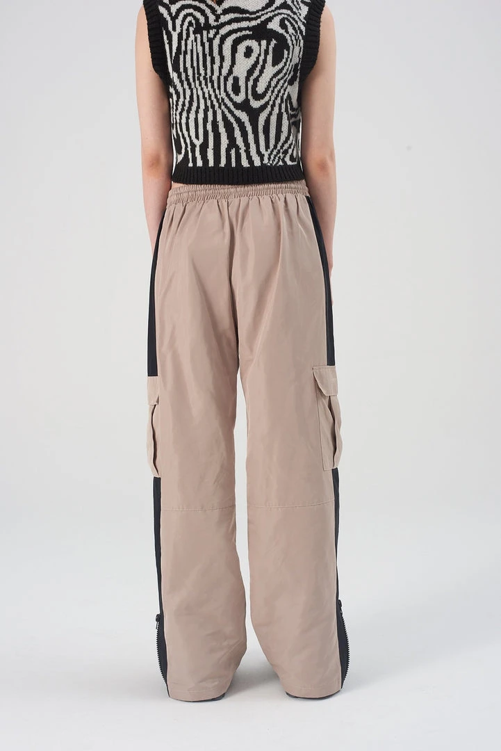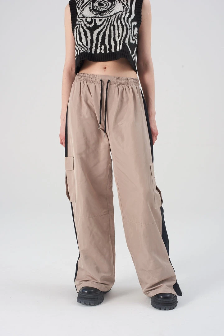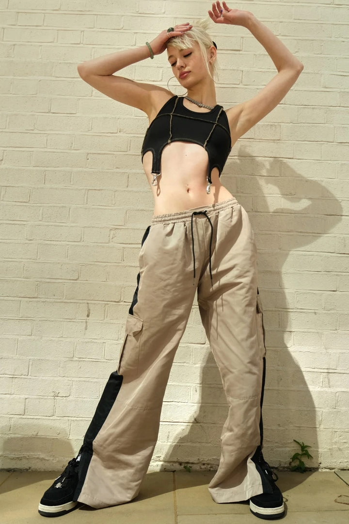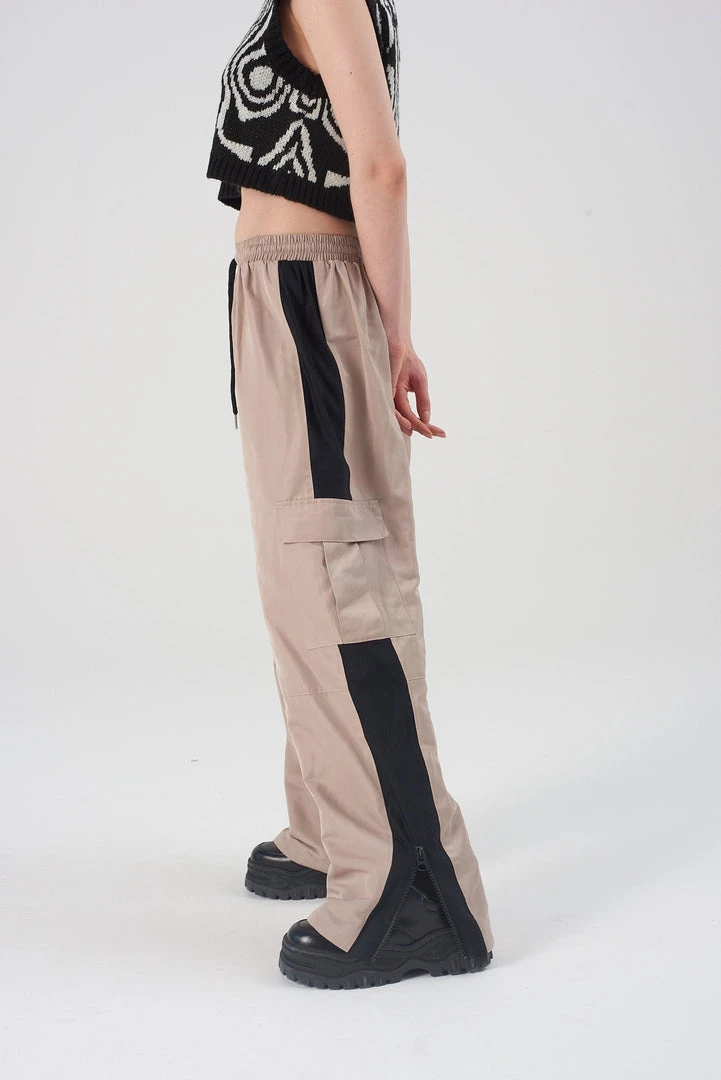 The Ragged Priest beige tracksuit bottoms with drawstring waist and contrast side panel detail.