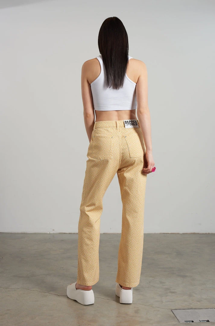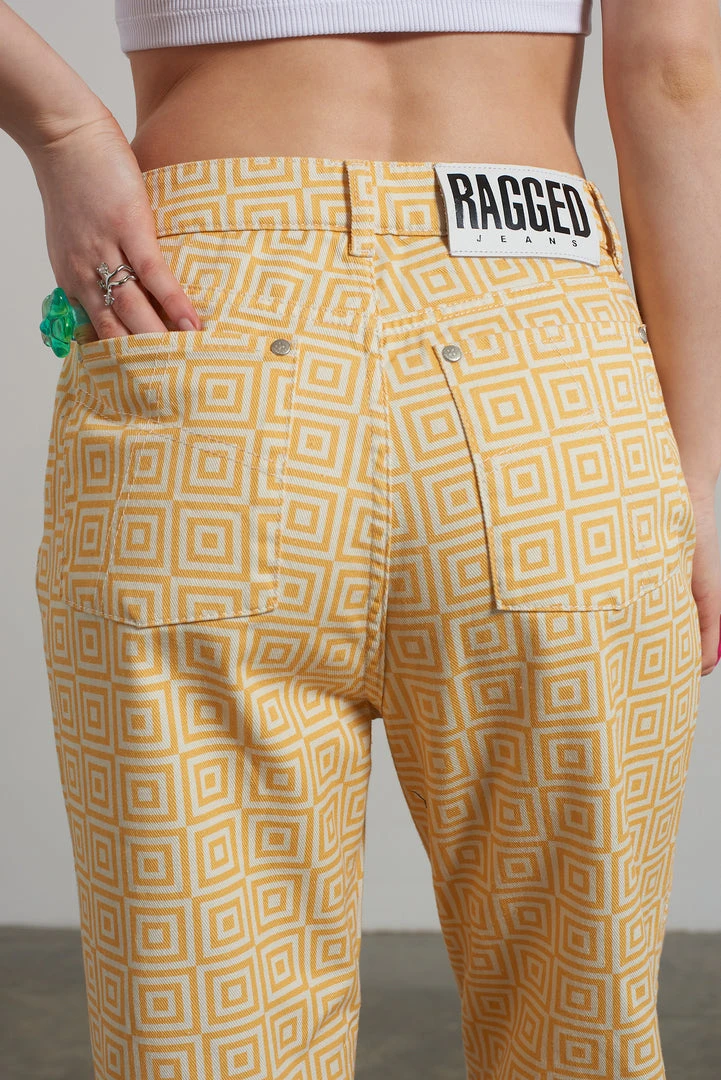 Ragged Jeans yellow and cream square print denim dad jeans.