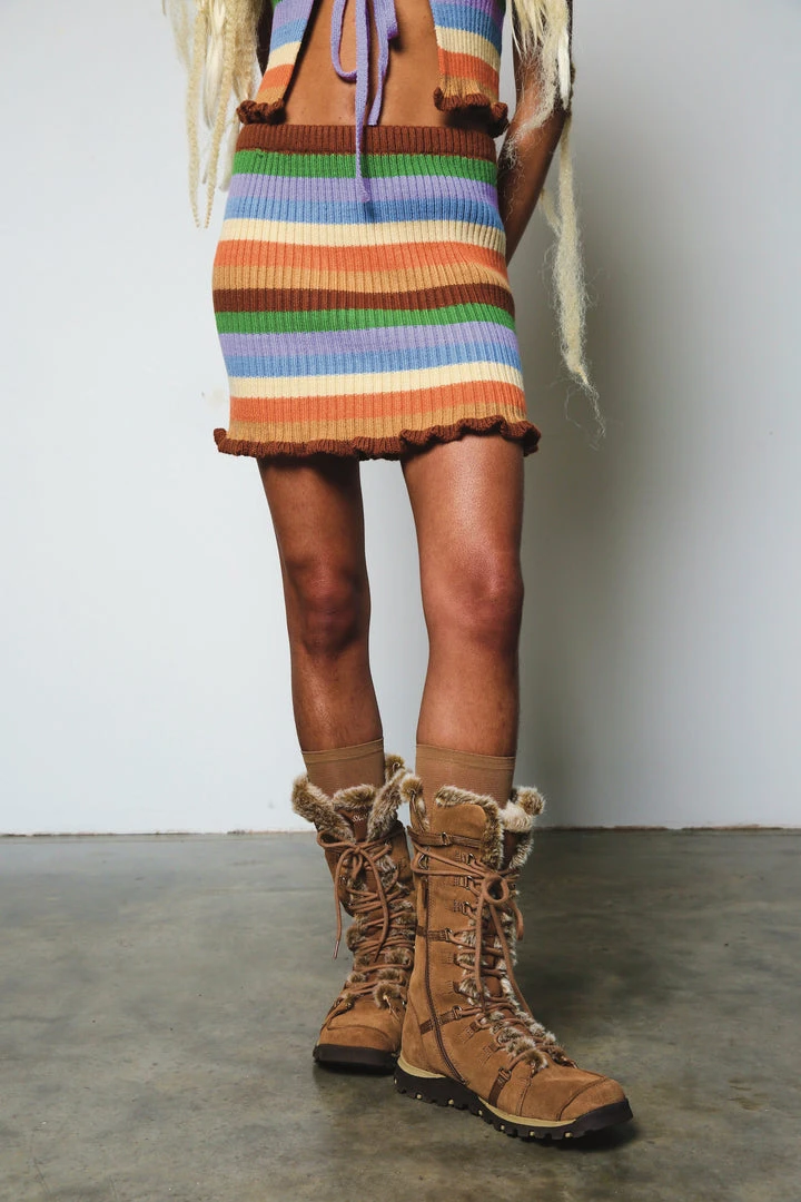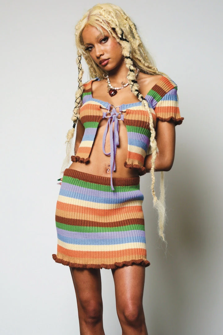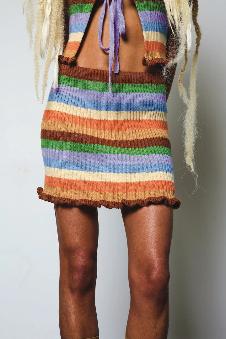 The Ragged Priest multi coloured striped chunky knitted mini skirt with frill bottom detail.