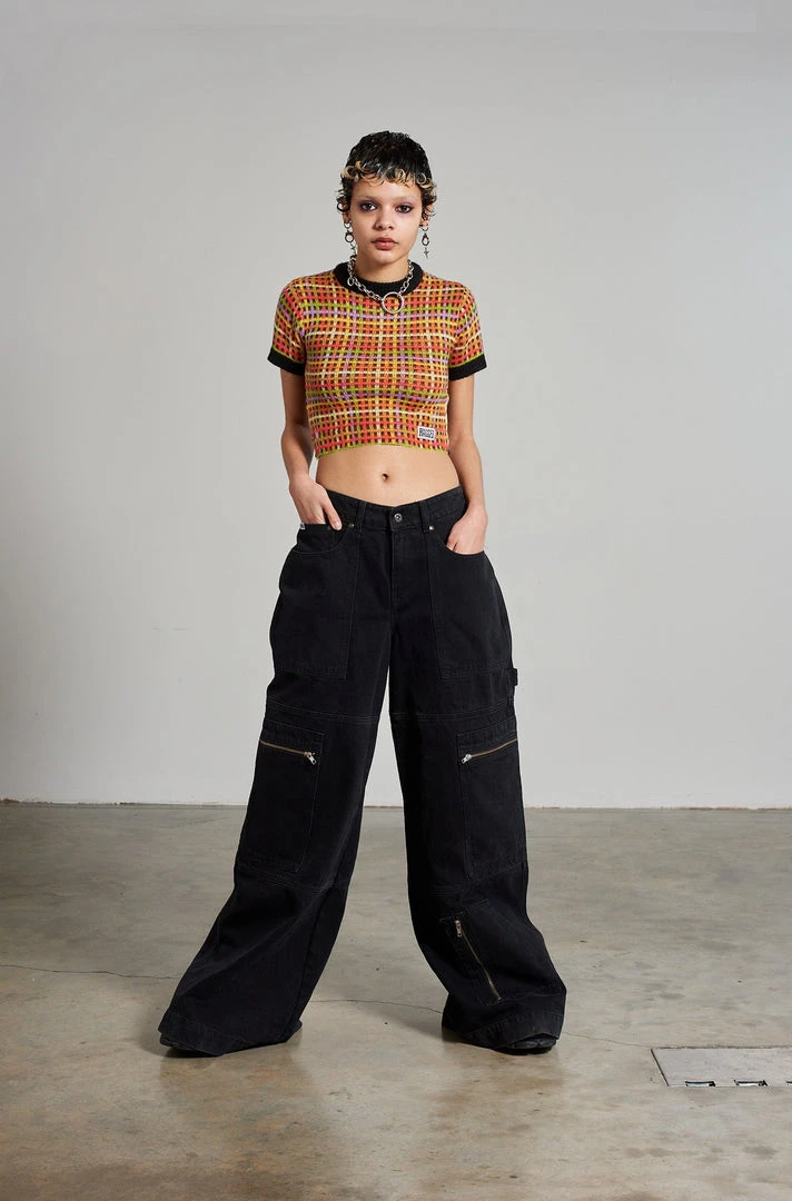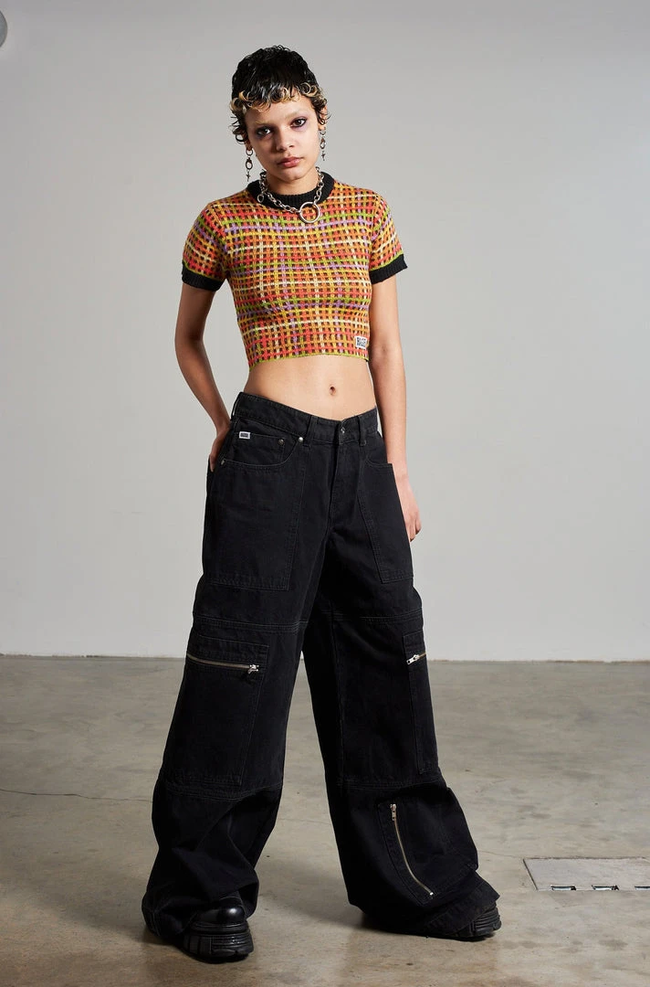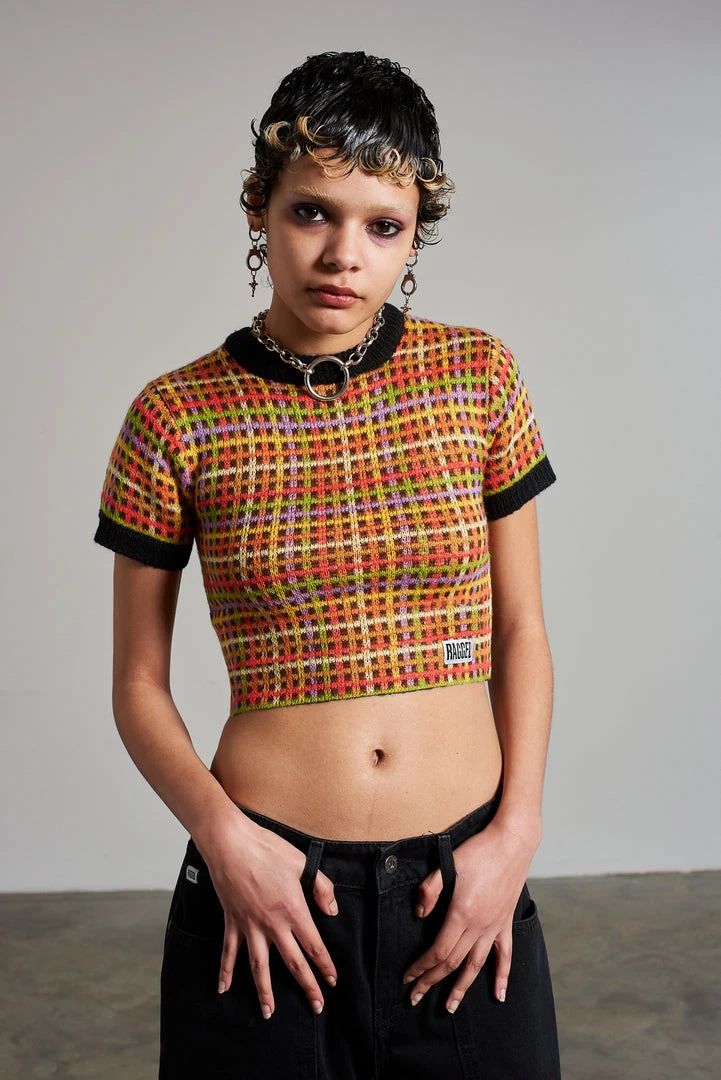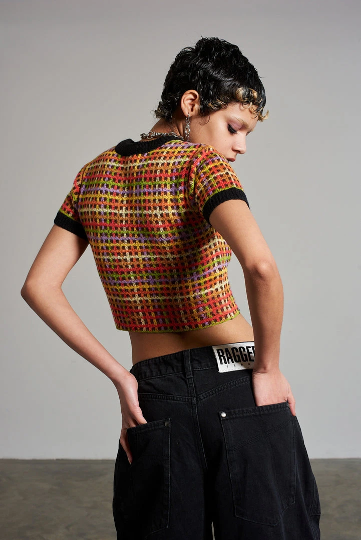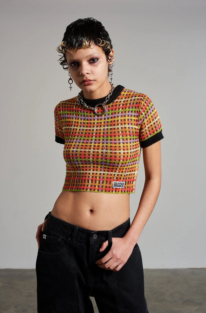 Ragged Jeans multi colour mini check printed print knitted top.