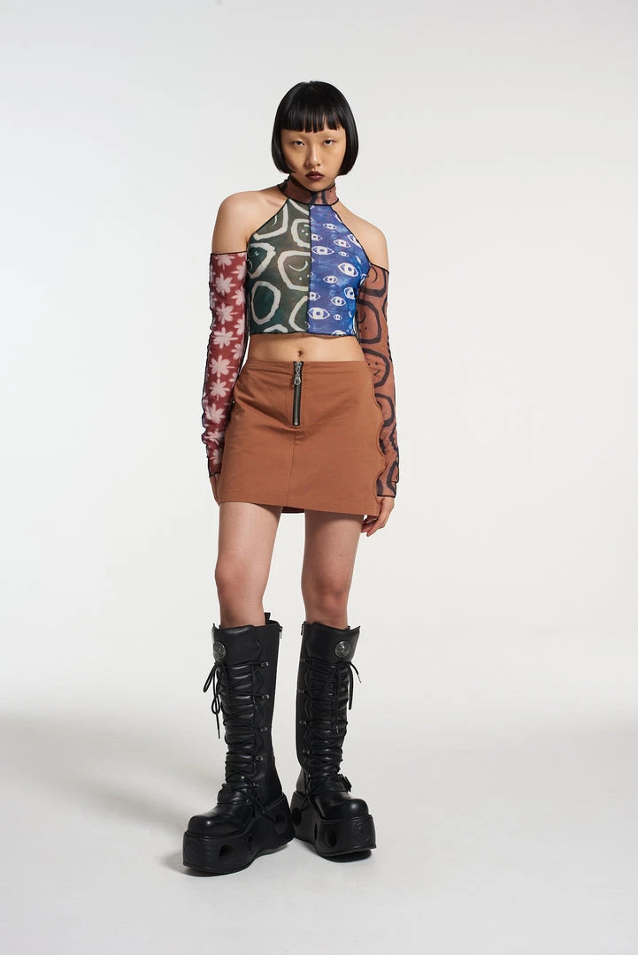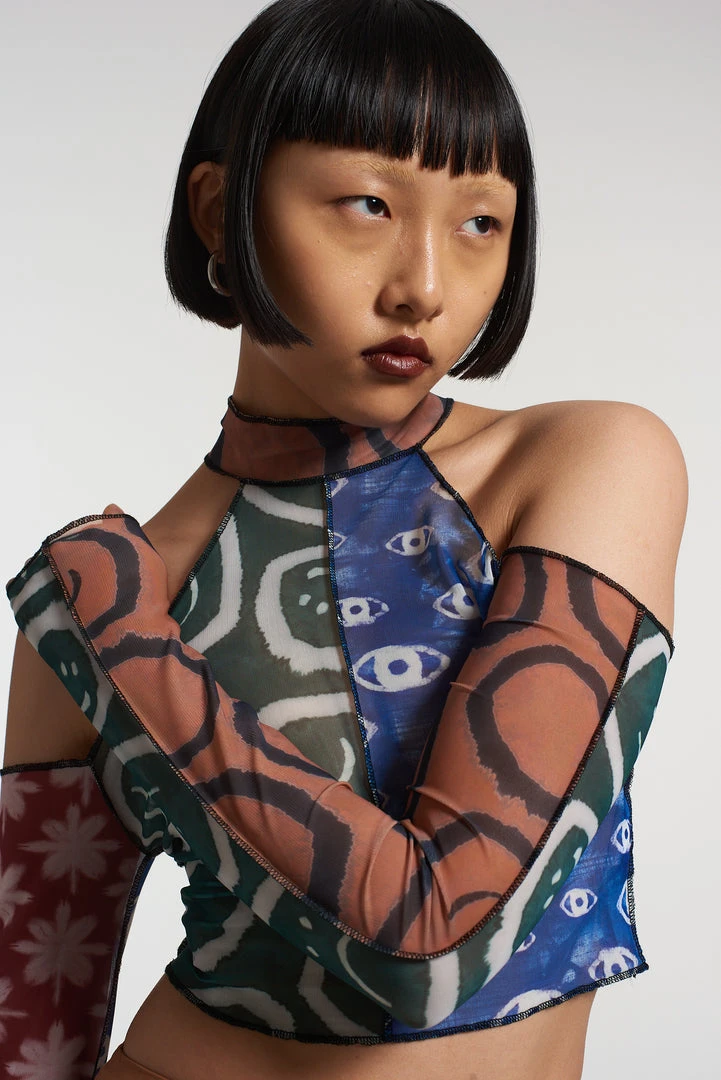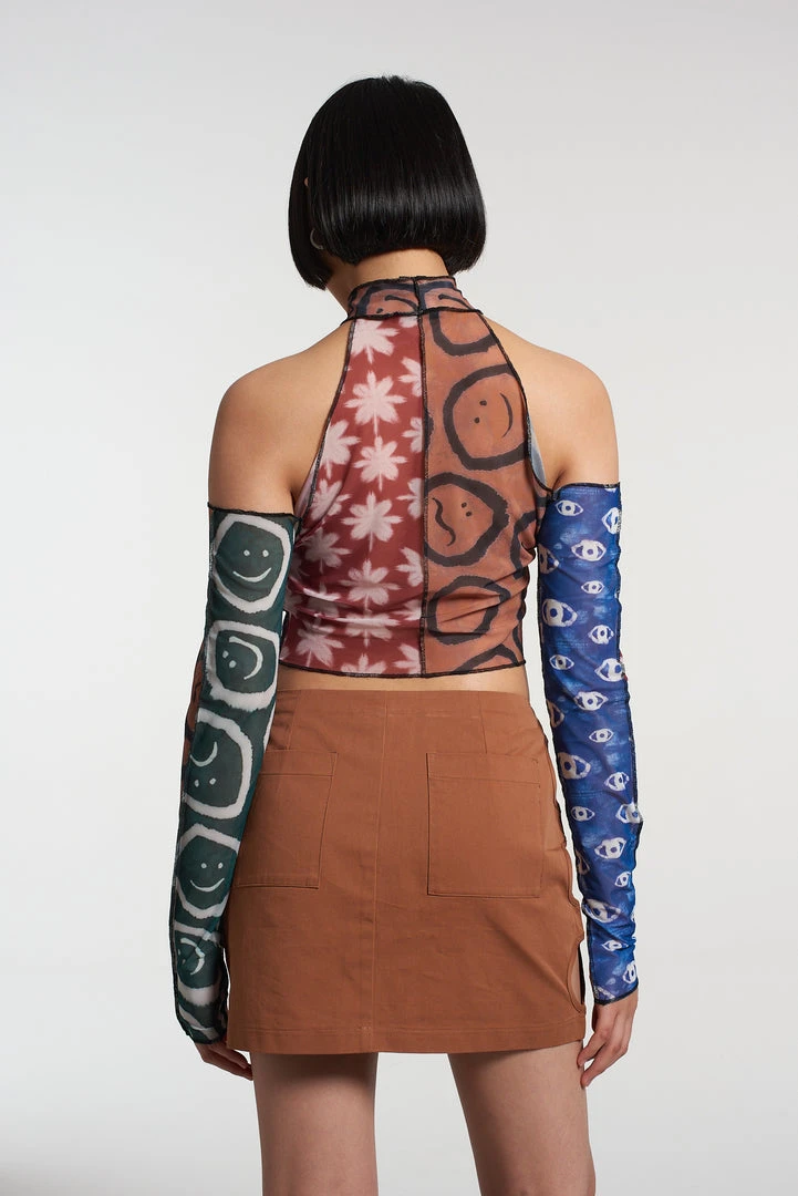 The Ragged Priest Multi panel patchwork graphic printed mesh tee with high neck, cold shoulder, sleeves and black overlock detail.Â