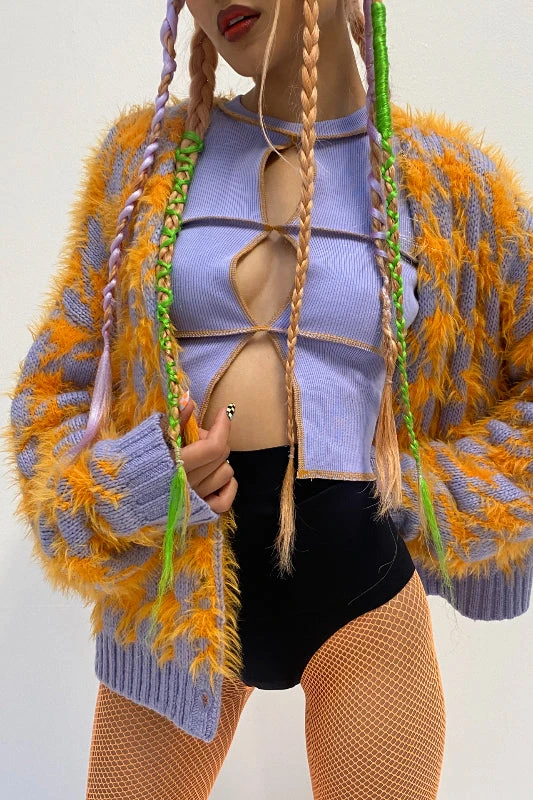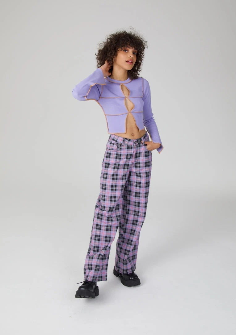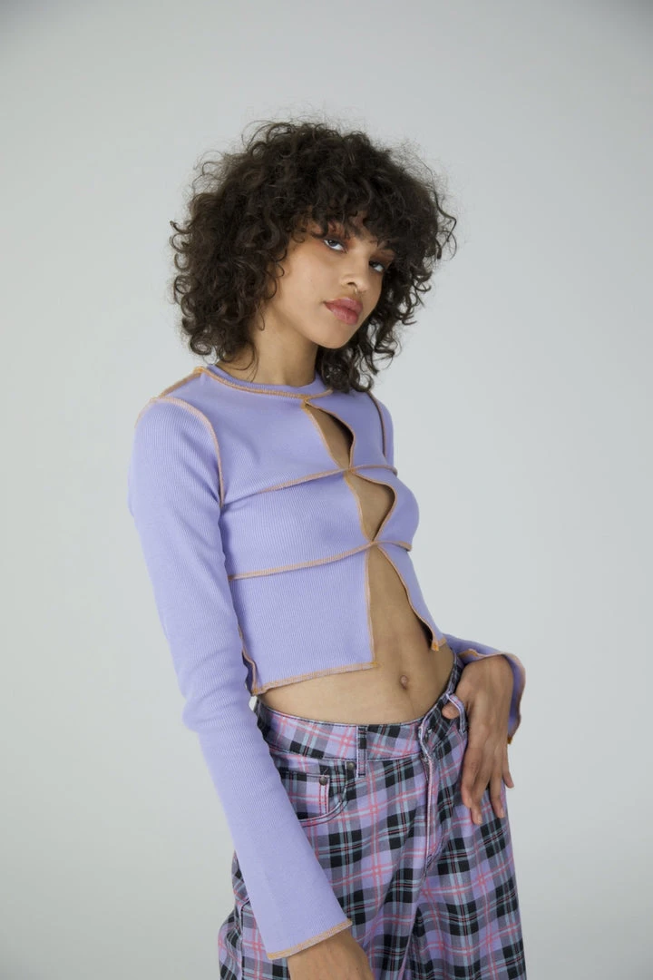 The Ragged Priest lilac long sleeve ribbed top with contrast overlock detail.