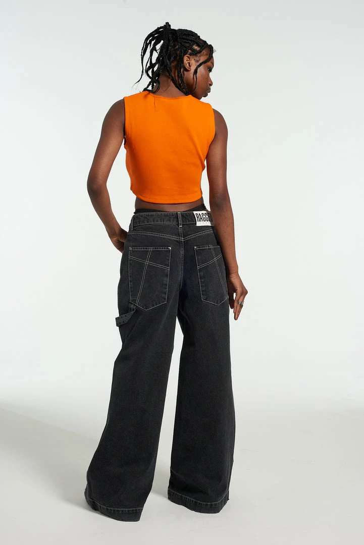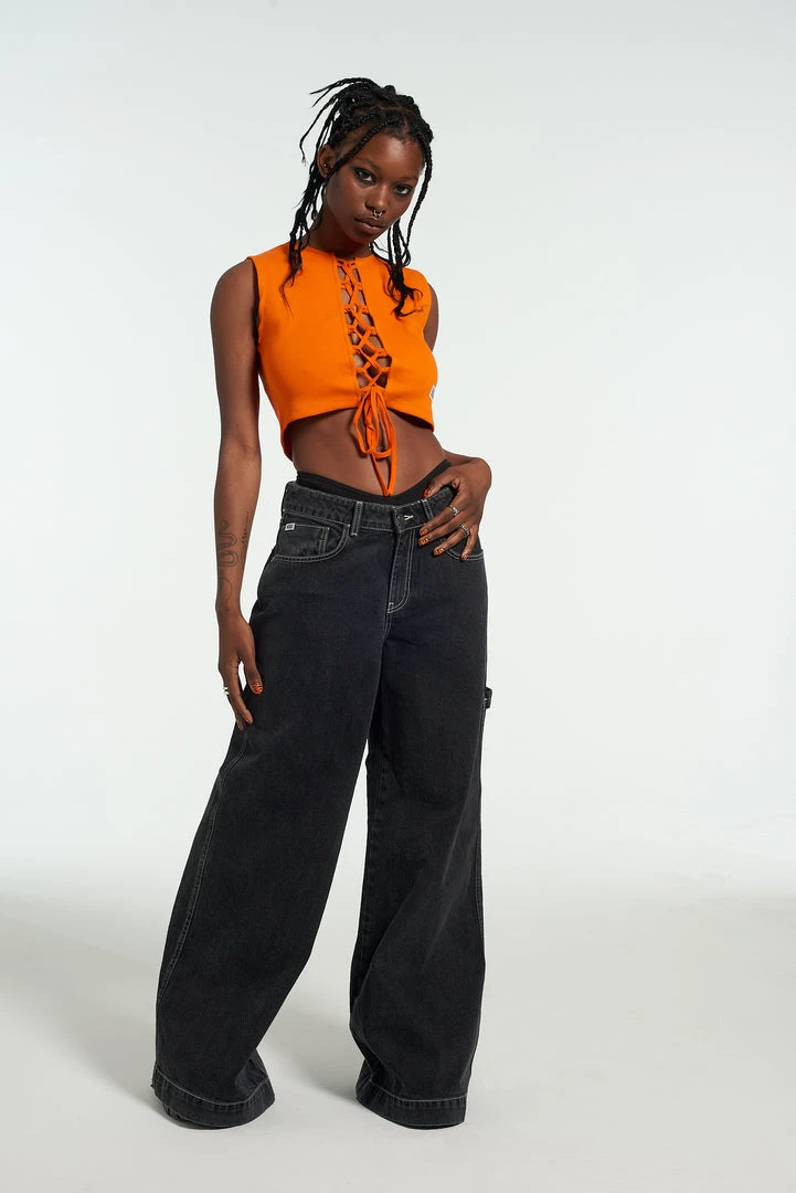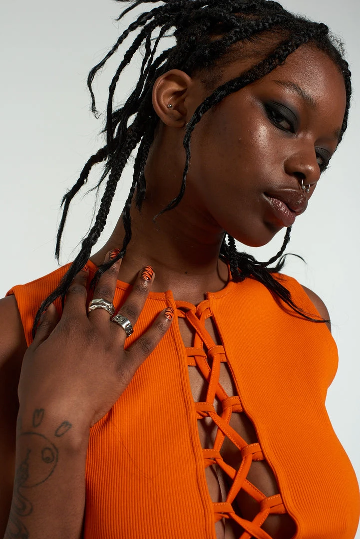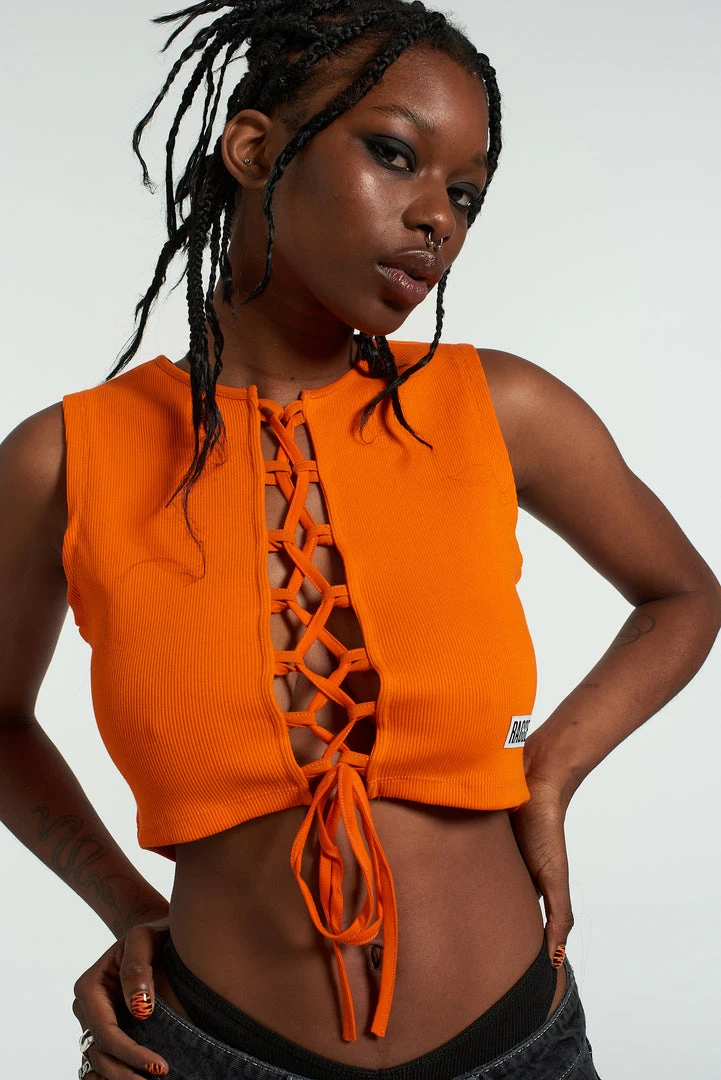 The Ragged Priest Orange crop top with cut out front and lace up detailing with tie finish.