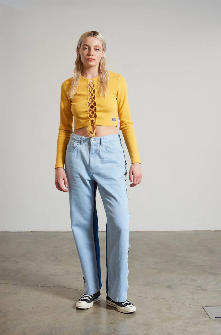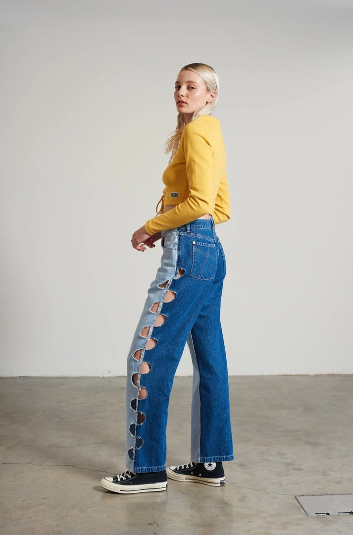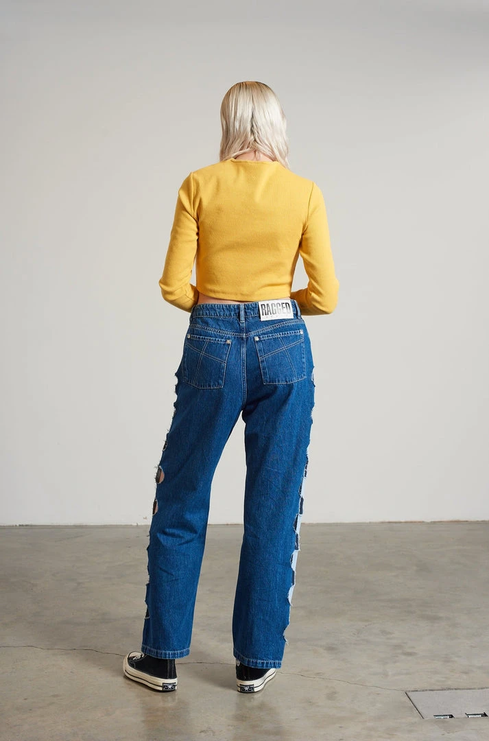 Ragged Jeans blue denim half and half dad jean with cut out side seam detail.